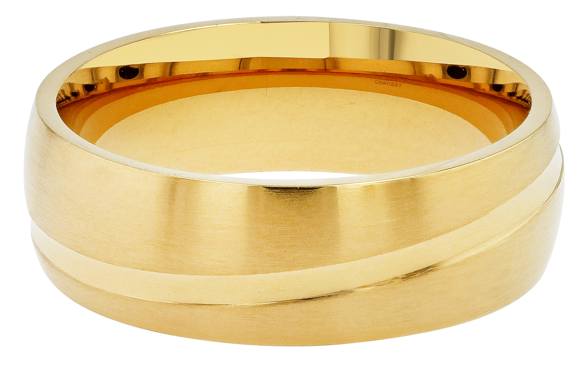 De brede ringband(8 mm, 2 mm dik) is mannelijk en geschikt om elke dag te dragen. Het ontwerp speelt met contrasten. Een matte afwerking wordt onderbroken door een hoogglans gepolijste lijn.