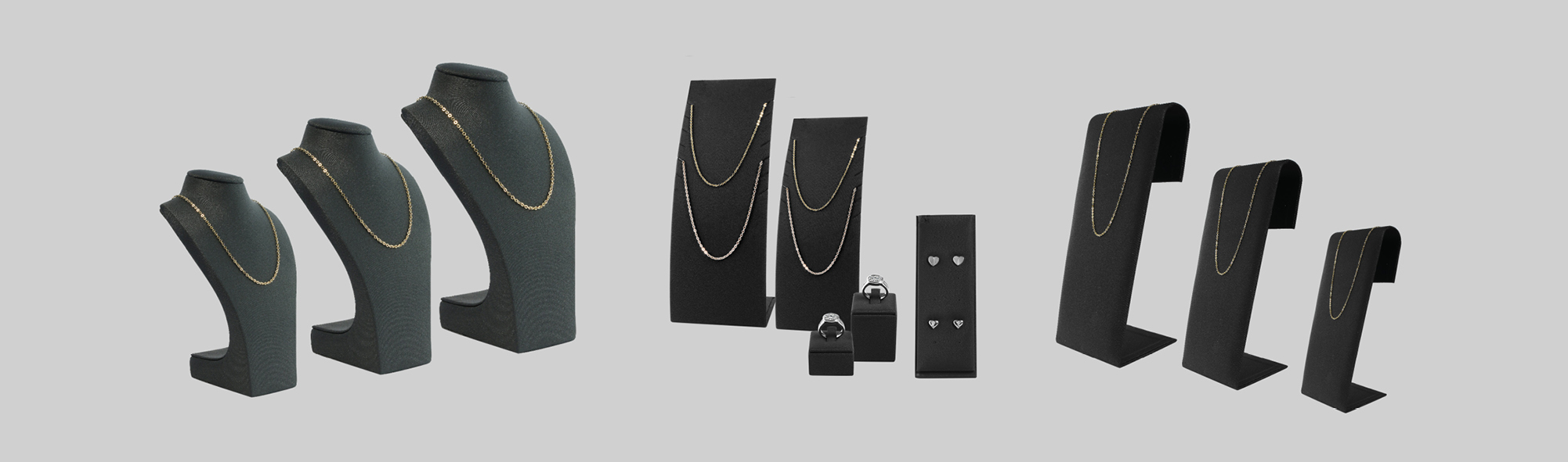 Verkrijgbaar in de beproefde kleuren zwart, grijs en wit, biedt de decoratieve serie "SOFT" u volledige flexibiliteit om uw presentatie perfect aan te passen aan de sfeer van uw winkel en de betreffende juwelencollectie. Of u nu goud, zilver of kleurrijke stenen presenteert - deze serie slaat altijd een goed figuur.