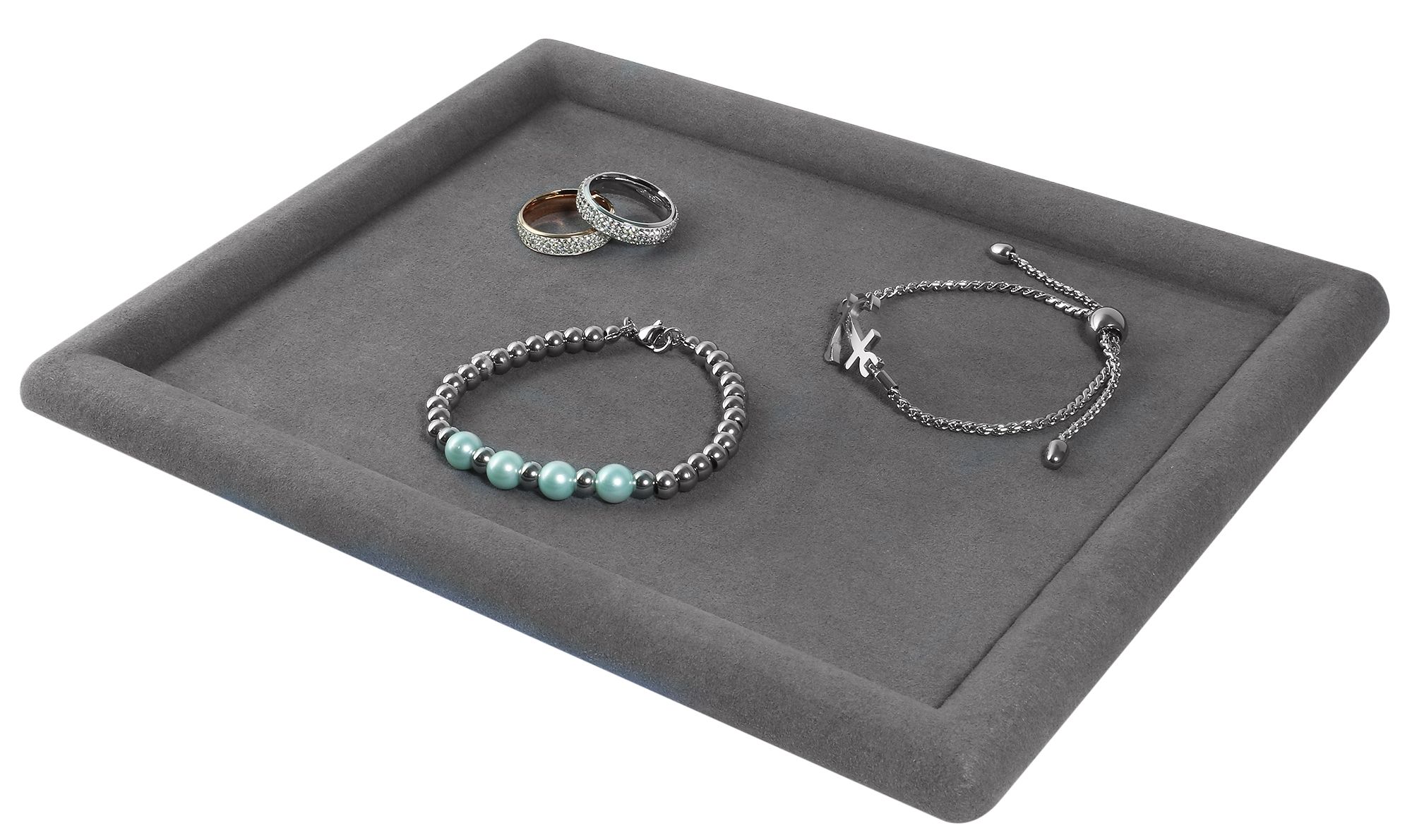 Met royale afmetingen van 20 x 25 x 1,5 cm vormt dit dienblad de ideale basis voor een stijlvolle presentatie van sieraden. Het met fluweel bedekte oppervlak geeft de presentatietray niet alleen een elegante uitstraling, maar zorgt er ook voor dat uw sieraden in een aantrekkelijke en beschermde omgeving worden gepresenteerd. Gebruik dit dienblad om uw sieraden te presenteren en uw klanten op een aantrekkelijke manier kennis te laten maken met uw collectie.