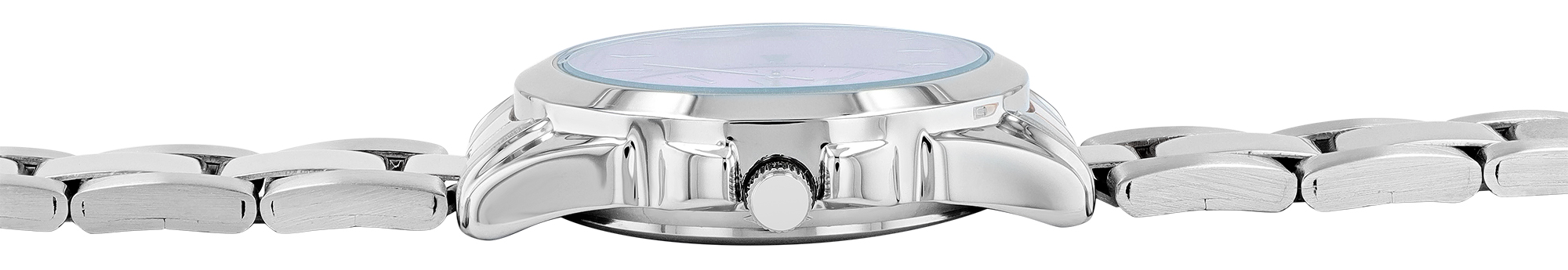 De lichtgevende wijzerplaat in een levendige paarse kleur is een bijzondere blikvanger en geeft het horloge een moderne en vrolijke uitstraling. D. De duidelijke lijnindex in combinatie met de praktische lichtgevende wijzers zorgt voor een goede afleesbaarheid, zelfs bij moeilijke lichtomstandigheden. De hoogwaardige roestvrijstalen schakelarmband in glanzend zilver benadrukt het duurzame karakter van dit horloge en kan veilig worden vastgemaakt met de praktische vouwsluiting.