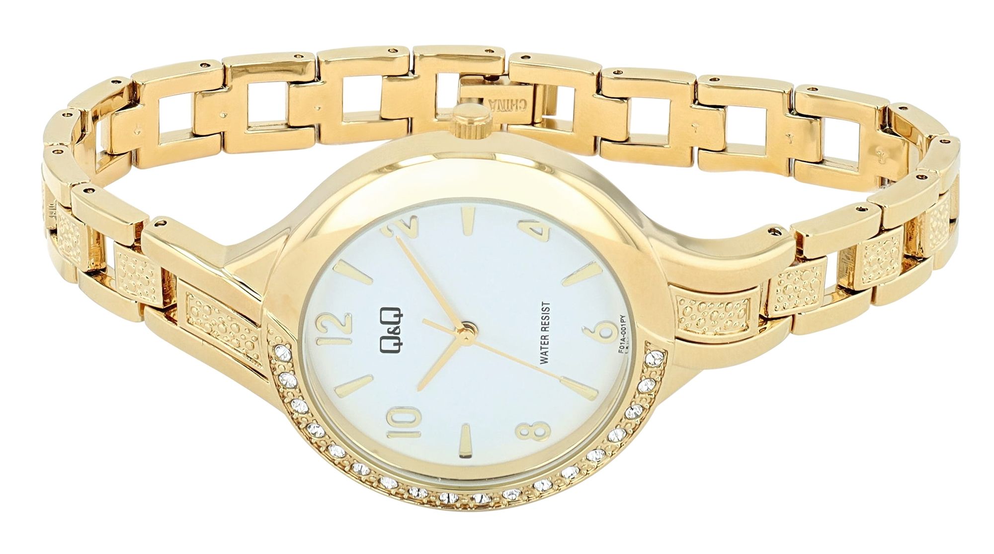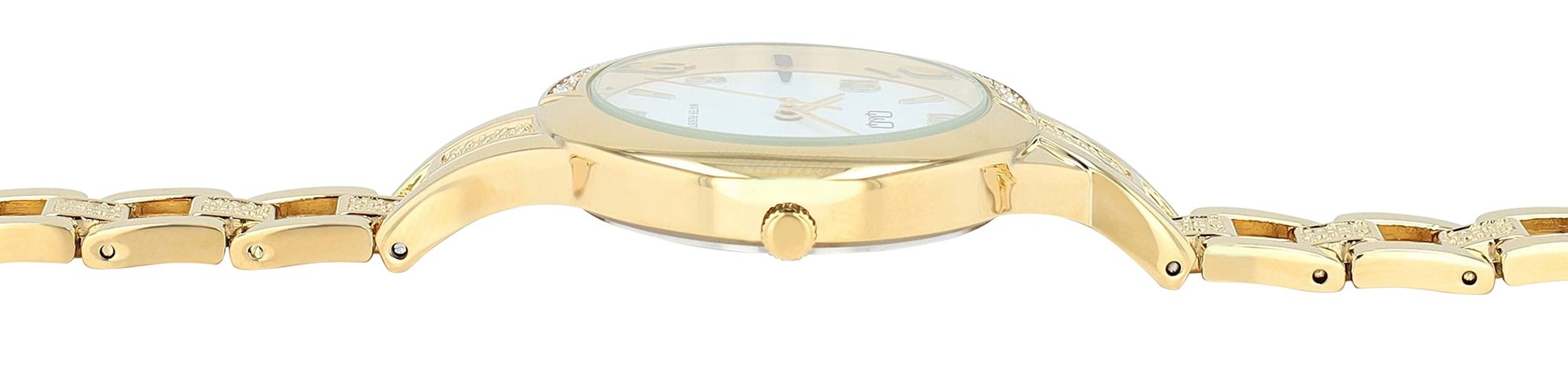 Productinformatie "Q&Q Damenuhr, Edelstahlband, Similibesatz, goldfarben, 3 ATM, Ø 34 mm"