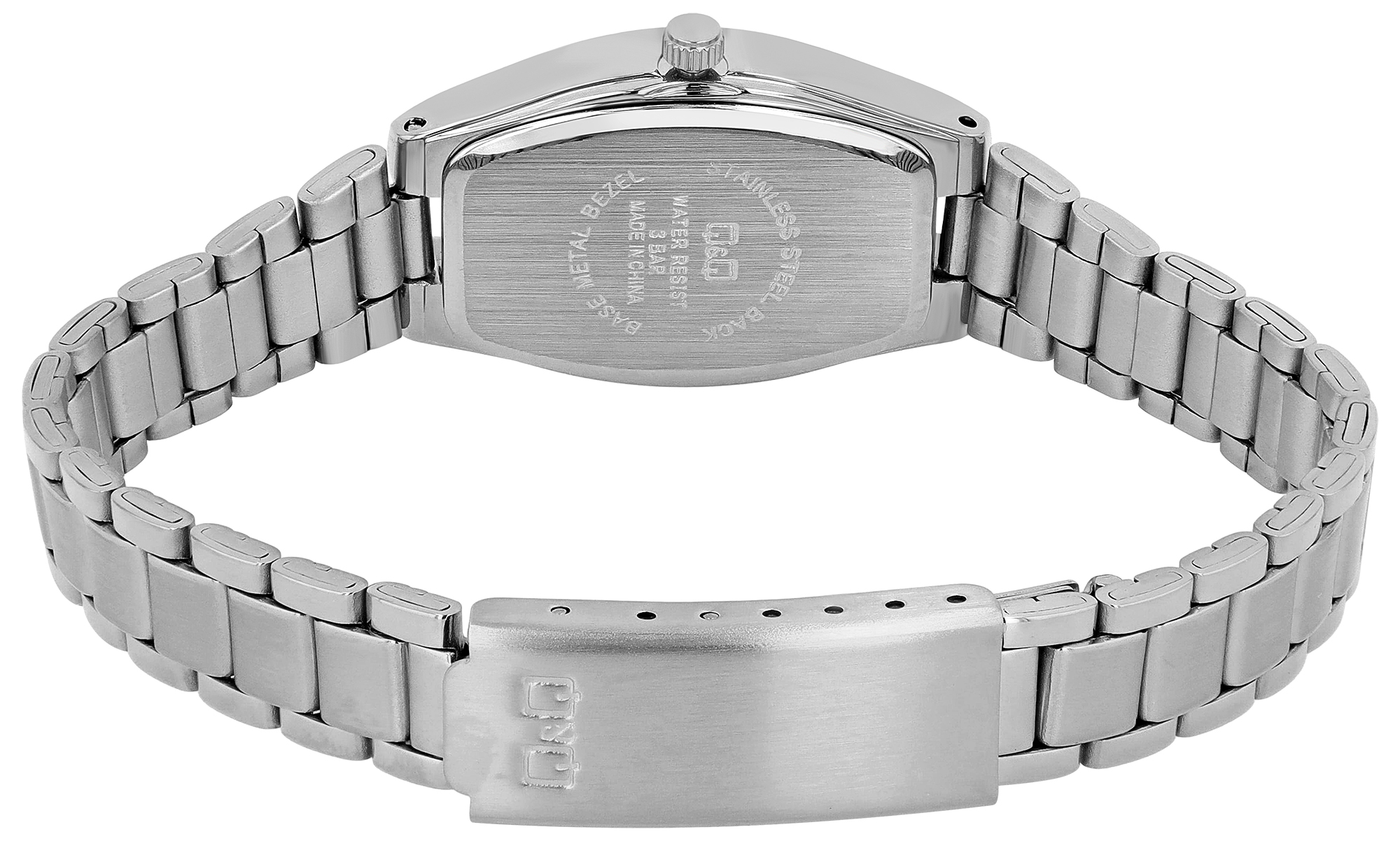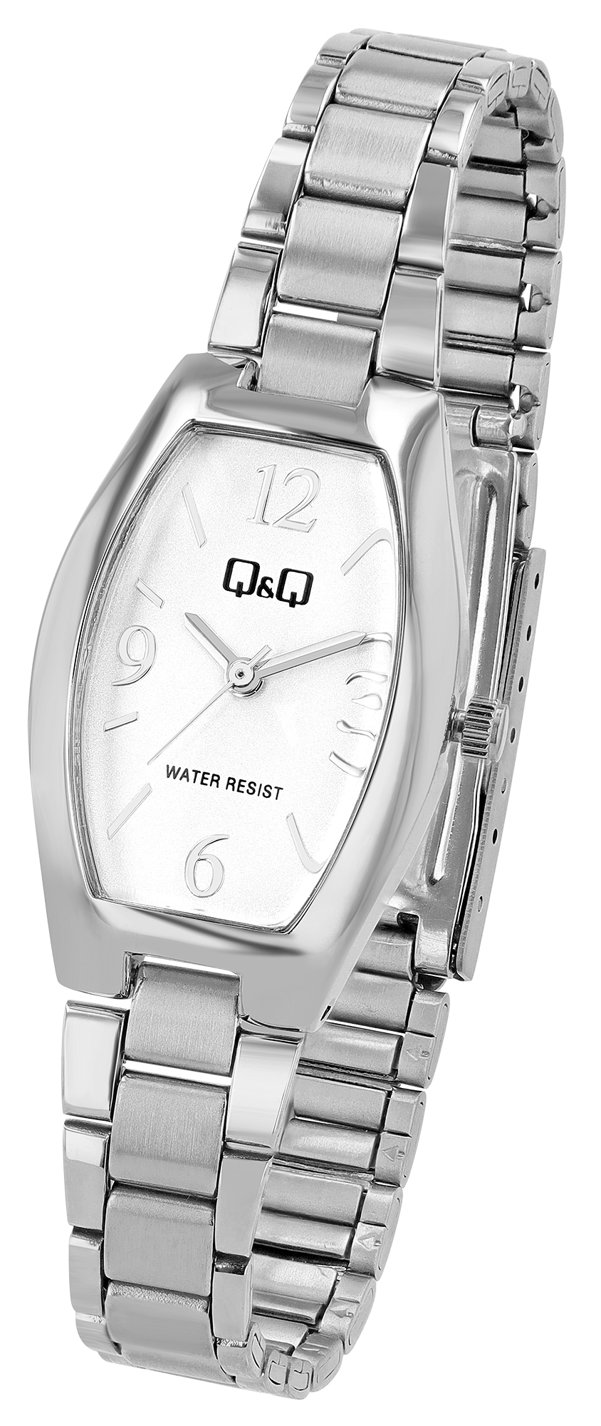 Dit dameshorloge van het merk Q&Q - by Citizen Watch Co. LTD (by Citizen Watch Co. LTD) maakt indruk op het gebied van design, functionaliteit en kwaliteit. De roestvrijstalen schakelarmband is niet alleen comfortabel om te dragen, maar heeft ook een elegante uitstraling. Dankzij de roestvrijstalen vouwsluiting en afneembare elementen kan het horloge worden aangepast zodat het perfect om de pols past. De kast is gemaakt van robuust metaal, terwijl de achterkant van de kast ook van roestvrij staal is, wat voor extra duurzaamheid zorgt. Met een totale lengte van 17 cm en een bandbreedte van 10 mm (12,5 mm bij de brug) past dit horloge perfect om elke pols. De kast in tonneau-stijl meet 30 mm in lengte, 22 mm in breedte en 10 mm in hoogte, waardoor het horloge een discrete maar opvallende aanwezigheid om de pols heeft. Het hoogwaardige quartz uurwerk binnenin zorgt voor een nauwkeurige tijdmeting, terwijl het mineraalglas de wijzerplaat betrouwbaar beschermt tegen krassen en stoten. Met een waterbestendigheid tot 3 bar is het horloge ideaal voor dagelijks gebruik. De witte wijzerplaat heeft duidelijk leesbare Arabische cijfers die zorgen voor een heldere en gemakkelijke afleesbaarheid. Het display met 3 wijzers zorgt voor een nauwkeurige tijdmeting en rondt het elegante ontwerp af.