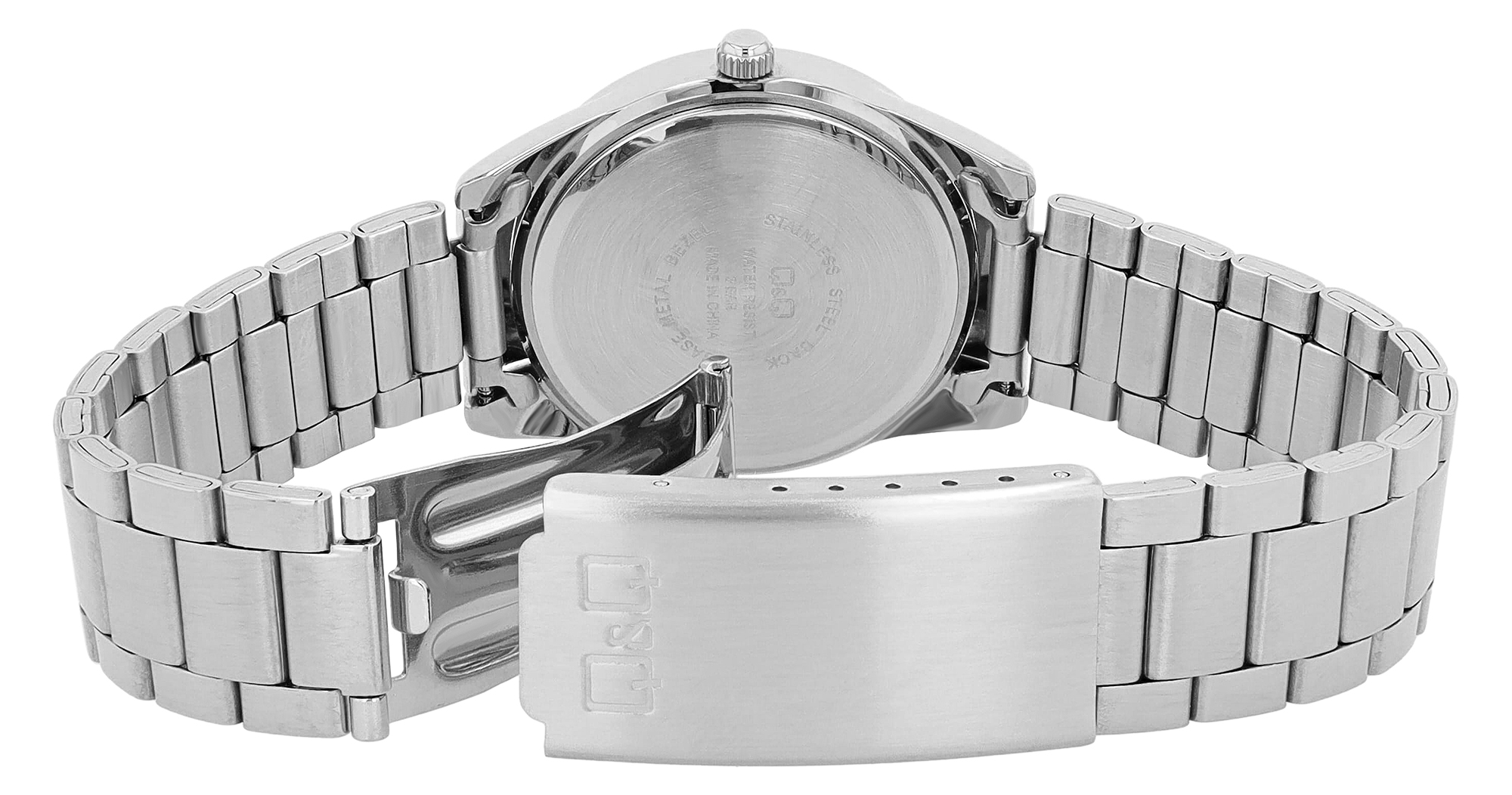 Haal het beste in kwaliteit en design in huis met dit Q&Q - by Citizen Watch Co. LTD (by Citizen Watch Co. LTD) dameshorloge dat elegantie en betrouwbaarheid perfect combineert. De robuuste en stijlvolle roestvrijstalen armband is stevig, duurzaam en kan ook worden ingekort om om elke pols te passen. De vouwsluiting zorgt voor een stevige grip en comfortabel dragen en is eenvoudig te bedienen. De kast is gemaakt van duurzaam metaal en heeft een roestvrijstalen achterkant, die duurzaamheid en extra bescherming biedt. De groene wijzerplaat, met uitzondering van 12 en 6 uur, is bezet met fonkelende Similis-steentjes als puntindex, wat zorgt voor een duidelijke en elegante leesbaarheid. De wijzers en cijfers zijn zilverkleurig. Met een totale lengte van 21,5 cm, een kastdiameter van 34 mm en een kasthoogte van 9 mm is dit horloge de perfecte mix van opvallend design en draagcomfort. De bandbreedte van 16 mm zorgt voor een slank, vrouwelijk silhouet en het horloge is ook waterbestendig tot 3 bar. Het nauwkeurige kwartsuurwerk garandeert een betrouwbare tijdmeting en is daarom ideaal voor dagelijks gebruik. Het slijtvaste mineraalglas beschermt de wijzerplaat tegen krassen en stoten, zodat het horloge er altijd goed uitziet, zelfs bij intensief gebruik.