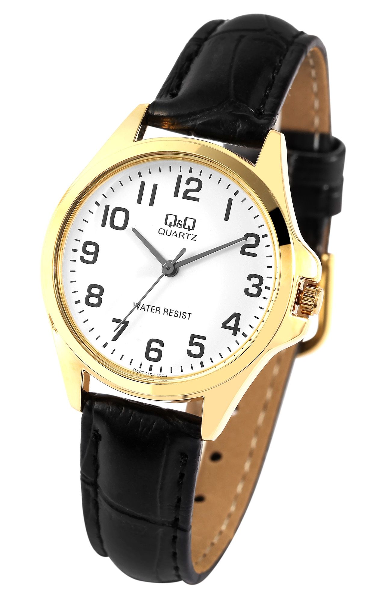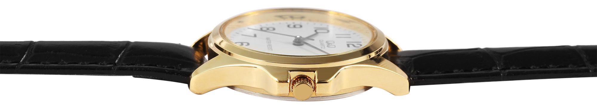 Het analoge 3-hands damespolshorloge van Q&Q - by Citizen Watch Co. LTD heeft een hoogwaardig quartz uurwerk. De zwarte imitatieleren band met krokodillen reliëf is 14 mm breed bij de lug en kan worden geopend en gesloten met een zilverkleurige gesp. De totale lengte van het horloge is 22 cm. De goudkleurige metalen kast met mineraalglas heeft een diameter van 30 mm en een kasthoogte van 8 mm. De achterkant van de kast is gemaakt van roestvrij staal. De wijzerplaat is wit en bedrukt met zwarte cijfers. De wijzers zijn zilverkleurig. Het horloge heeft ook een waterdichtheid van 3 bar.