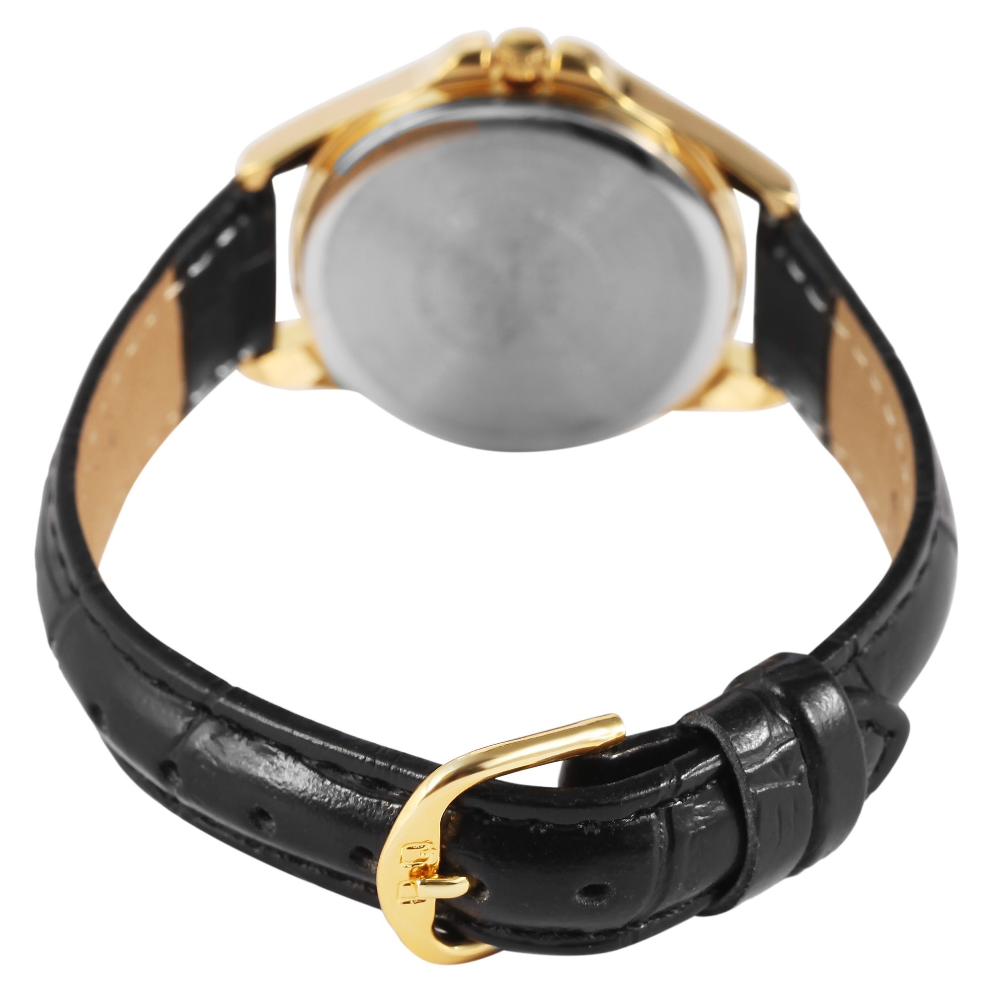Productinformatie "Q&Q Damenuhr mit Lederimitationsarmband in schwarz/goldfarben, 3 bar"