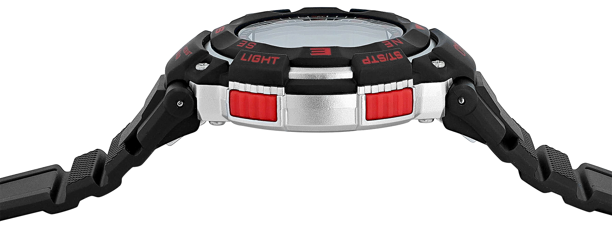 Het zwart met zilverkleurige digitale horloge is een echt sportief statement voor mannen en jonge mannen die waarde hechten aan prestaties en stijl. Centraal staat een nauwkeurig quartz uurwerk, ingebed in een duurzame kunststof kast met een solide roestvrijstalen achterkant en beschermend kunststof glas. De dynamische esthetiek wordt benadrukt door de helderrode accenten op de pushers en de bezel, die zowel de intuïtieve bediening benadrukken als een sportief contrast vormen met het overheersende zwart. De wijzerplaat maakt indruk met zijn duidelijke, digitale display en de opvallende rangschikking van de informatie om optimale leesbaarheid te garanderen. Met een compacte diameter van 36 mm en een hoogte van 12 mm zit hij comfortabel om de pols.