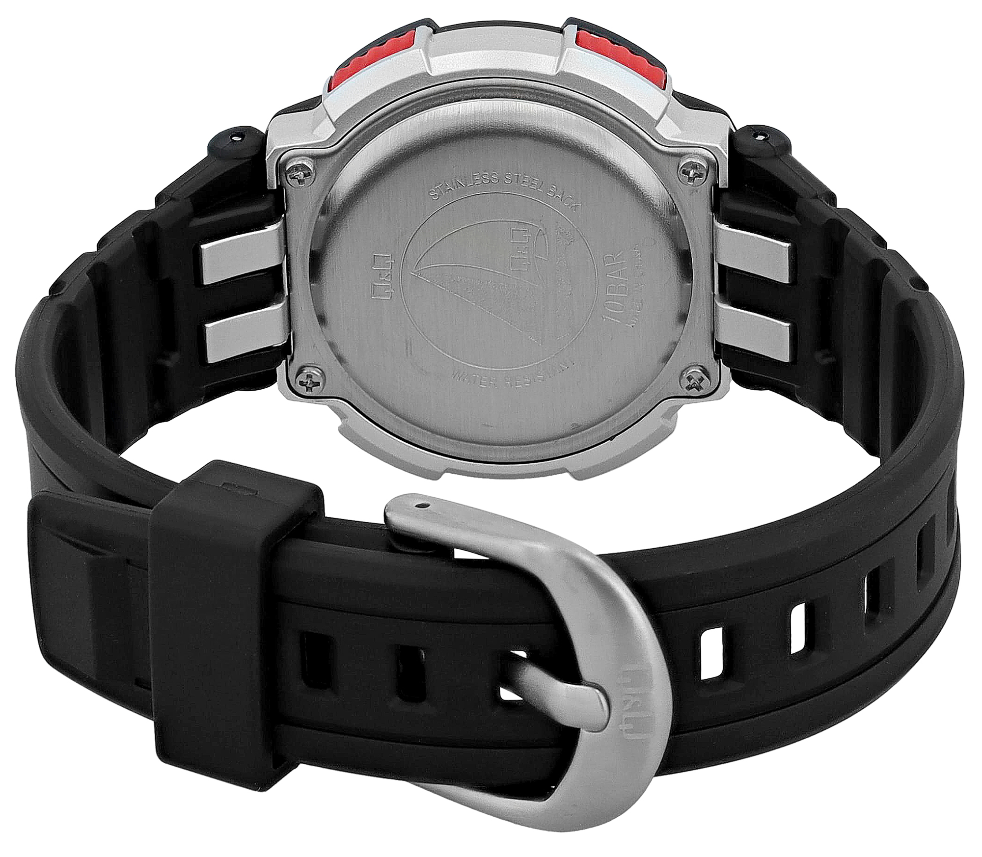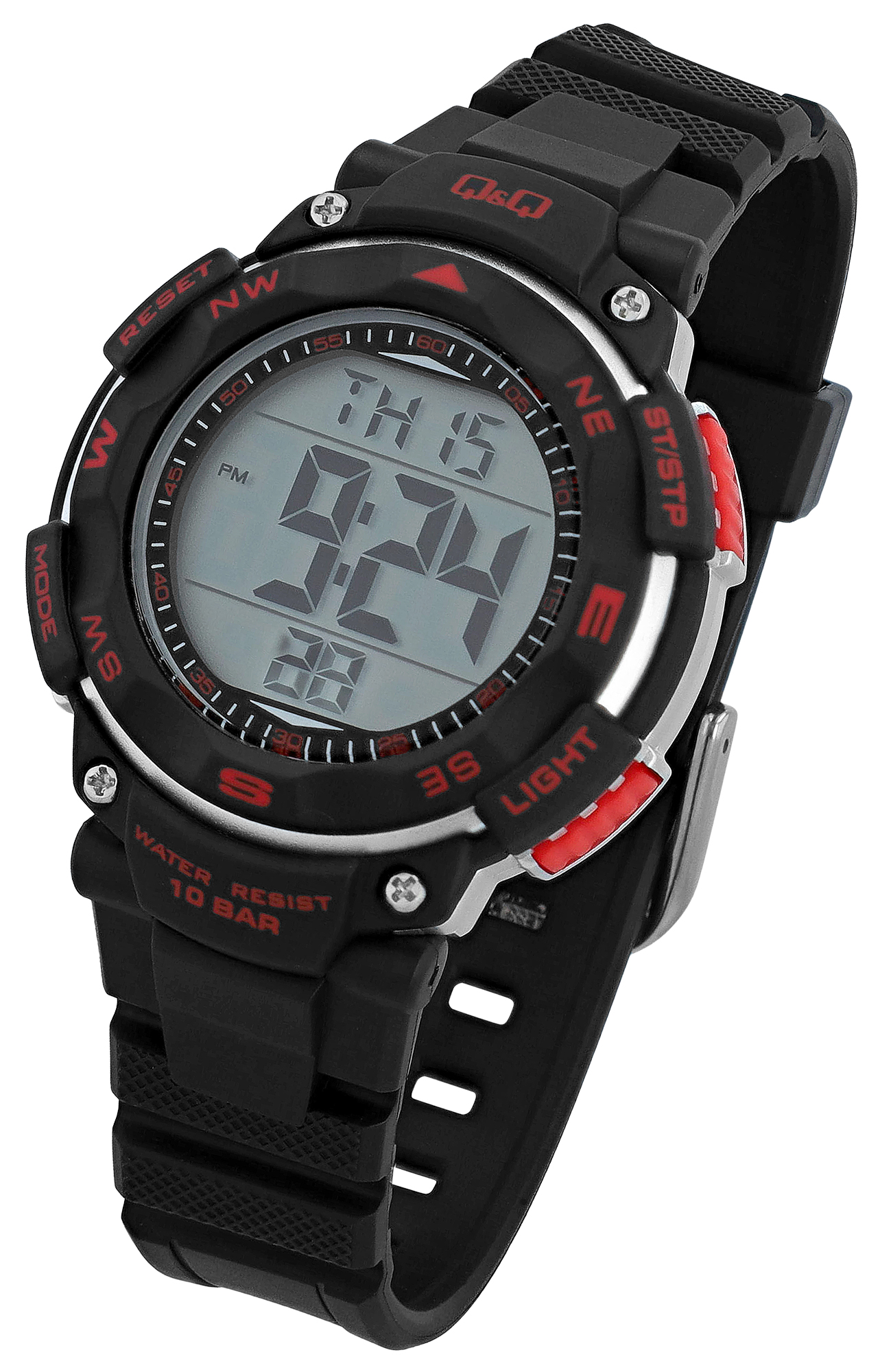 Functionaliteit is een topprioriteit bij dit krachtige Q&Q - by Citizen Watch Co. LTD horloge: een 24-uurs display, datumweergave, twee tijdzones voor wereldwijde flexibiliteit, een betrouwbare alarmfunctie, een nauwkeurige stopwatch en een praktische achtergrondverlichting maken het horloge tot een multifunctioneel instrument voor het dagelijks leven en daarbuiten. De duidelijk zichtbare labeling van de functies (MODE, RESET, ST/STP, LIGHT) op de lunette is niet alleen praktisch, maar draagt ook bij aan de technische, sportieve look van het horloge.