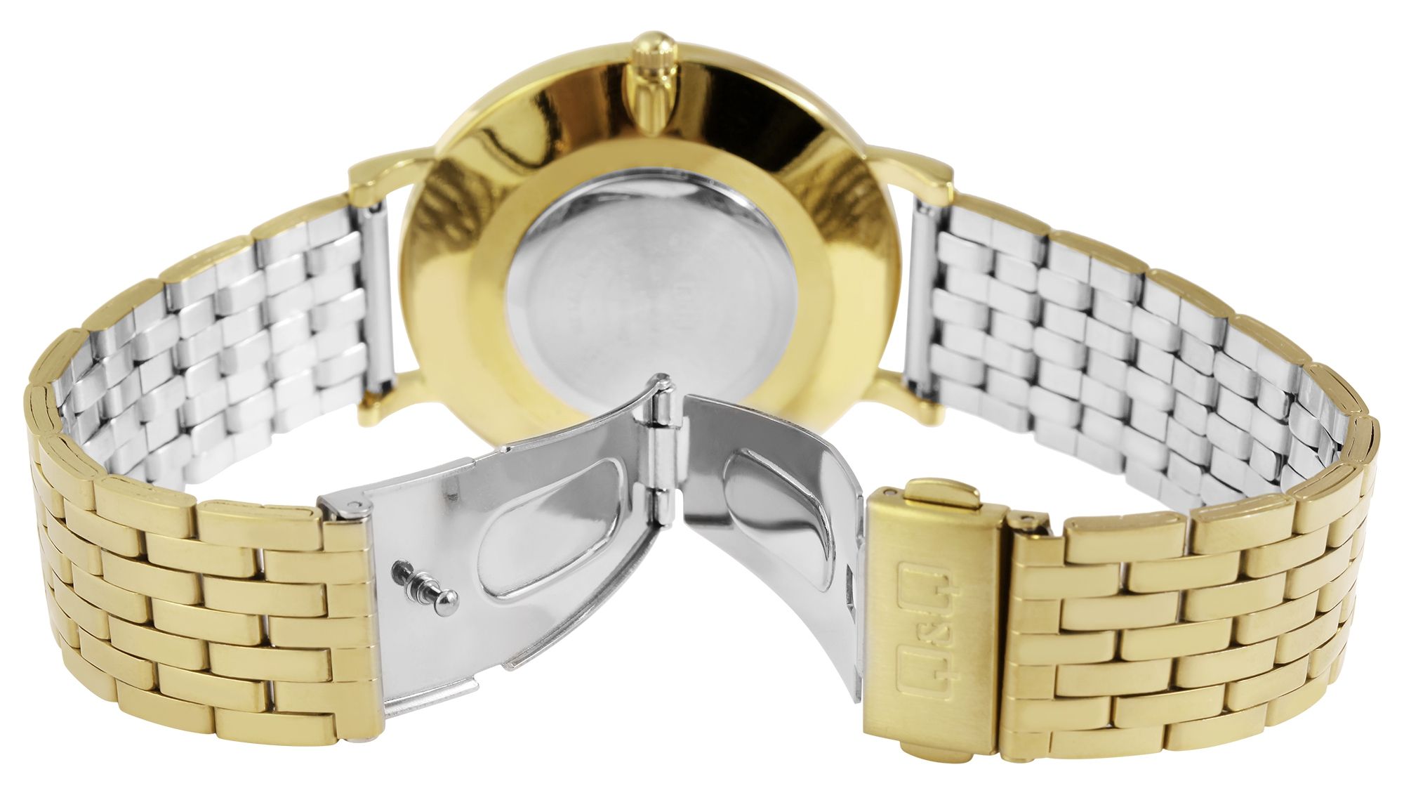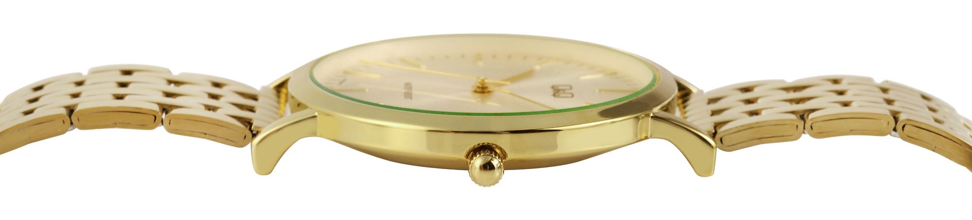 Het analoge 3-hands herenpolshorloge van Q&Q - by Citizen Watch Co. LTD heeft een hoogwaardig quartz uurwerk. De goudkleurige roestvrijstalen armband is 18 mm breed bij de lug en kan worden geopend en gesloten met een goudkleurige roestvrijstalen vouwsluiting. De totale lengte van het horloge is 22,5 cm. De ronde metalen kast met mineraalglas heeft een diameter van 40 mm en een kasthoogte van 7,5 mm. De achterkant van de kast is gemaakt van roestvrij staal en het horloge heeft een waterdichtheid van 3 bar. De wijzerplaat heeft een helder ontwerp. De wijzers en indexen zijn ook goudkleurig en ronden de algehele look van het herenhorloge harmonieus af.
