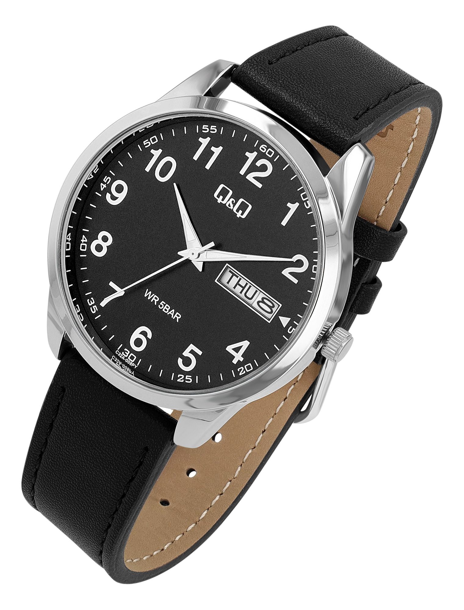 Productinformatie "Q&Q Herrenuhr mit Lederband, 5 ATM, Wochentags- & Datumsanzeige, schwarz"