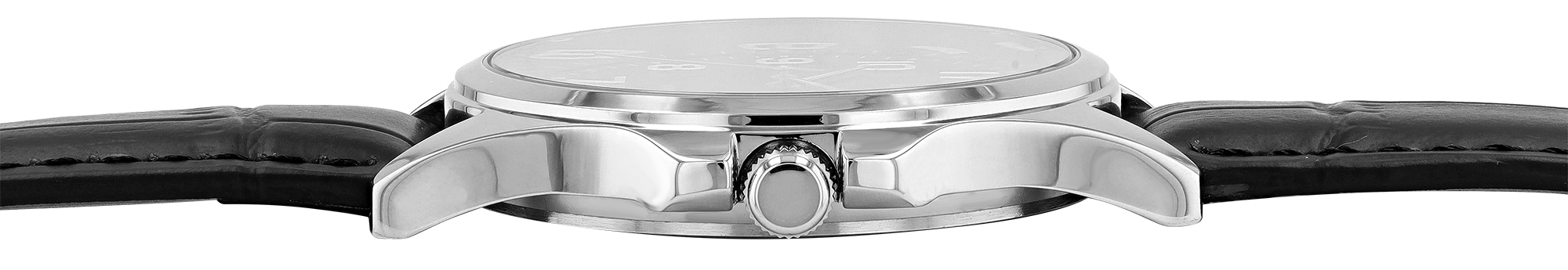 De zilverkleurige metalen kast met een diameter van 40 mm en een platte hoogte van slechts 8 mm ligt elegant tegen de pols. Een bijzonder functioneel hoogtepunt is de coating van de wijzers en indexen met Superluminova van hoge kwaliteit, die ervoor zorgt dat de tijd altijd precies kan worden afgelezen, zelfs bij volledige duisternis.