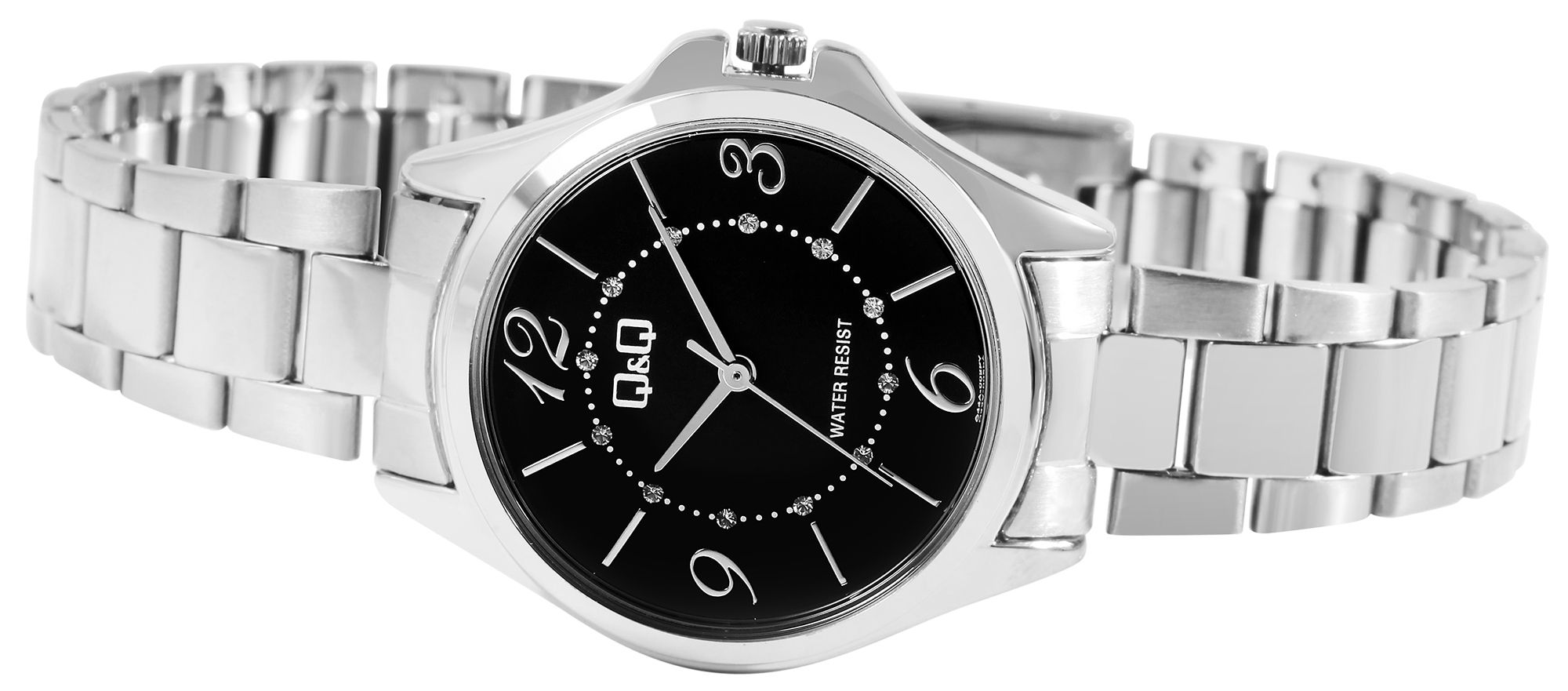 Het analoge 3-hands damespolshorloge van Q&Q - by Citizen Watch Co. LTD heeft een hoogwaardig en nauwkeurig Miyota quartz uurwerk. De zilverkleurige roestvrijstalen armband is 14 mm breed bij de lug en kan worden geopend en gesloten met een roestvrijstalen vouwsluiting. De horlogeband is bijzonder robuust en duurzaam en kan naar wens worden ingekort met een geschikt gereedschap dankzij de afneembare elementen. De totale lengte van het horloge is 20,5 cm. De zilverkleurige metalen kast met mineraalglas heeft een diameter van 30 mm en een kasthoogte van 7,5 mm. De combinatie van de glanzende horlogekast en de gedeeltelijk matte schakelarmband vormt een harmonieuze eenheid. De duidelijk vormgegeven wijzerplaat met zilverkleurige staafindexen en Arabische cijfers maakt het gemakkelijk om de tijd af te lezen. De focus ligt op de binnenste ring van de wijzerplaat, die is versierd met talrijke simili-stenen. De achterkant van de kast is ook gemaakt van roestvrij staal en het horloge heeft een waterdichtheid van 3 bar. Dankzij de hoogwaardige materialen is dit uurwerk bijzonder huidvriendelijk en dus ideaal voor mensen met allergieën. Het dameshorloge maakt indruk met zijn klassieke en elegante ontwerp en kan bij talloze gelegenheden worden gedragen.
