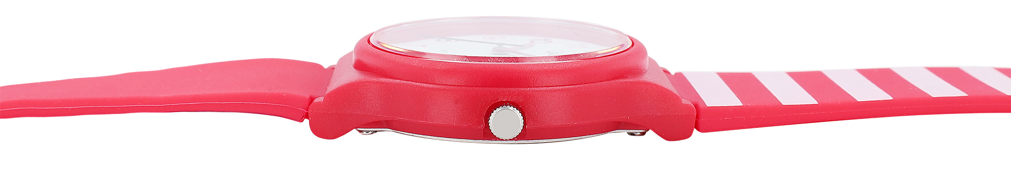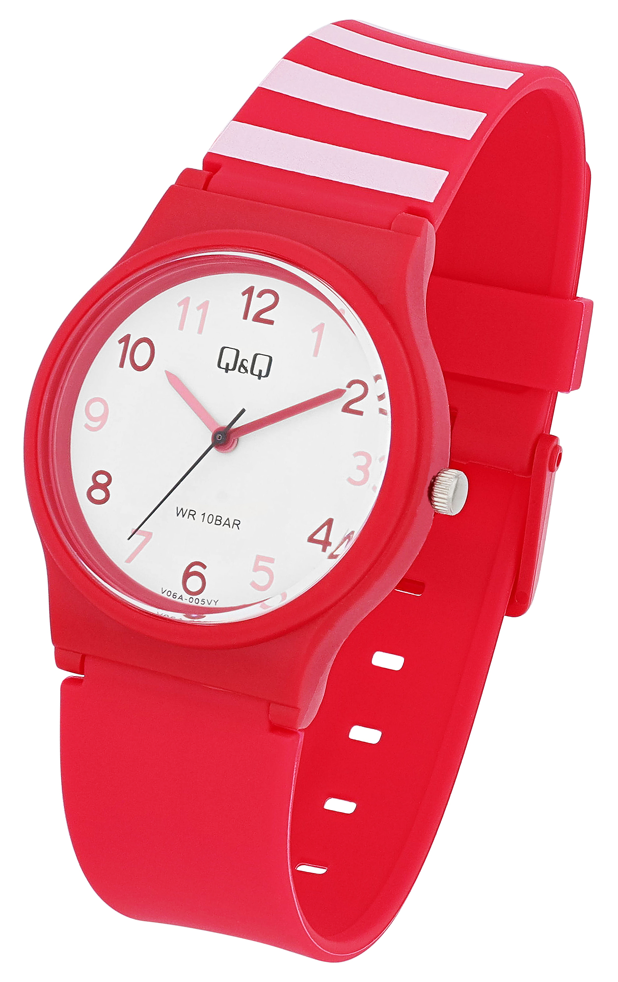 Het analoge 3-hands damespolshorloge van Q&Q - by Citizen Watch Co. LTD heeft een hoogwaardig en nauwkeurig quartz uurwerk. De rood-wit gestreepte siliconen band is 20 mm breed bij de lug en kan worden geopend en gesloten met een rode gesp. De totale lengte van het horloge is 24 cm. De kunststof kast met kunststof kristal heeft een diameter van 34 mm en een kasthoogte van 10 mm. De achterkant van de kast is gemaakt van roestvrij staal en is aan de kast bevestigd met vier roestvrijstalen schroeven. De tijd is gemakkelijk af te lezen dankzij de duidelijk vormgegeven wijzerplaat met Arabische cijfers. De zachte siliconen band maakt het horloge ook comfortabel om te dragen en de onderhoudsvriendelijke materialen maken het bijzonder gemakkelijk schoon te maken. De waterbestendigheid van 10 ATM en het sportieve ontwerp maken van dit horloge het perfecte horloge om elke dag te dragen.
