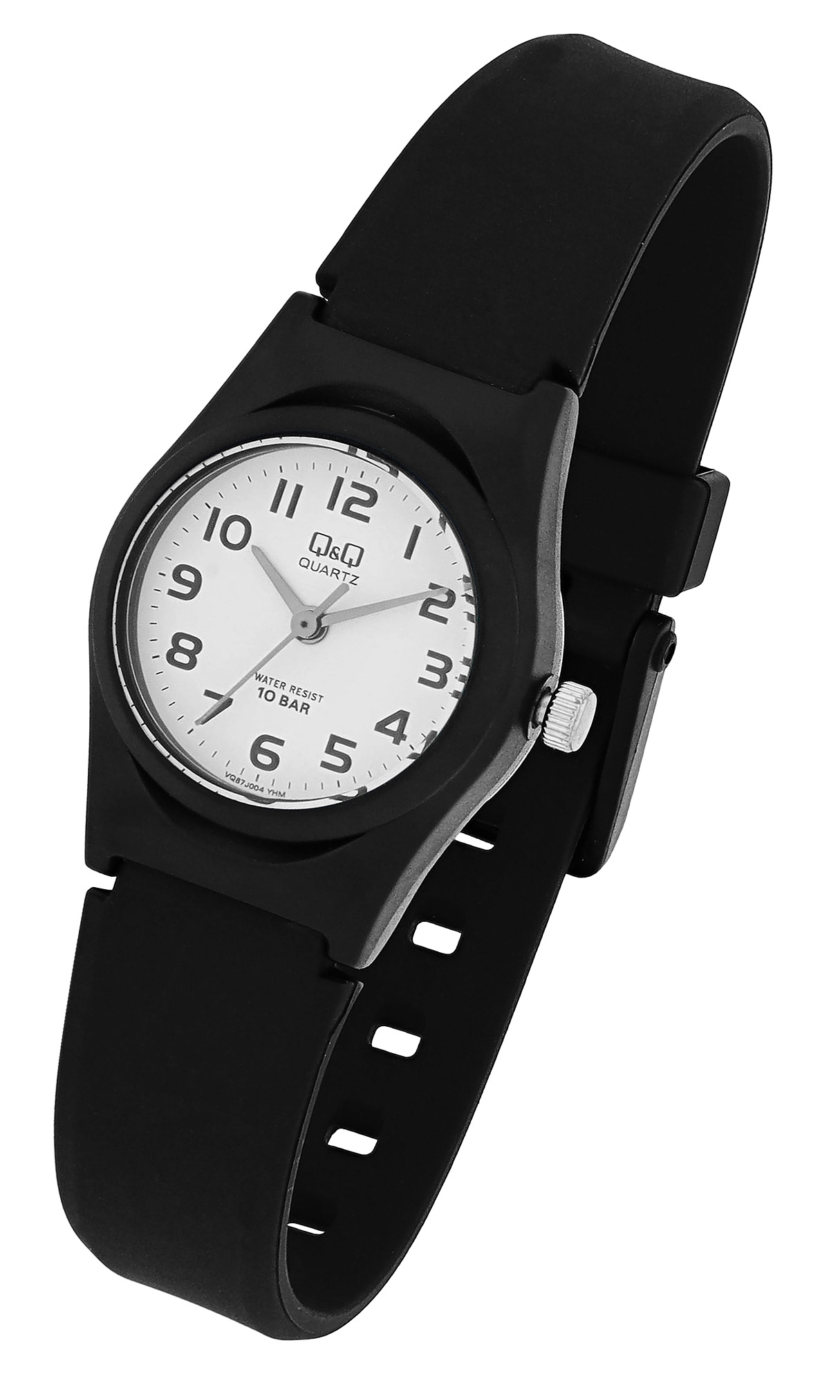 Het analoge 3-hands damespolshorloge van Q&Q - by Citizen Watch Co. LTD heeft een hoogwaardig quartz uurwerk. De zwarte siliconen band biedt niet alleen optimaal draagcomfort, maar is ook bijzonder duurzaam en flexibel. Met een breedte van 15 mm en een totale lengte van 22,2 cm past het perfect om de pols en wordt het vastgezet met een zwarte kunststof gesp. De kast is gemaakt van robuust kunststof, terwijl de roestvrijstalen achterkant met vier schroeven extra stabiliteit en duurzaamheid biedt. Met een diameter van 24 mm en een hoogte van 10 mm is de kast zowel opvallend als comfortabel om te dragen. Het kunststof horlogeglas beschermt de wijzerplaat betrouwbaar tegen krassen en stoten. De witte wijzerplaat wordt gecompleteerd door zwarte Arabische cijfers en zwarte wijzers, wat zorgt voor een duidelijke en gemakkelijke leesbaarheid. Het horloge heeft ook een waterdichtheid van 10 bar, waardoor het ideaal is voor elke activiteit.