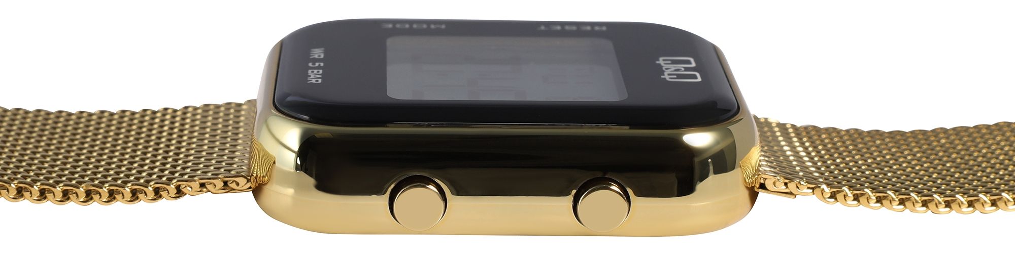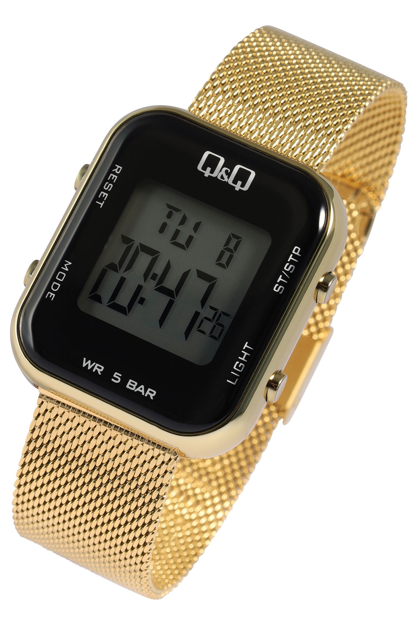 Dit veelzijdige Q&Q - by Citizen Watch Co. LTD digitale horloge voor dames is niet alleen mooi om te zien dankzij de robuuste goudkleurige kunststof kast met roestvrijstalen achterkant en de goudkleurige mesh band met vouwsluiting, maar is ook waterbestendig tot een diepte van 50 meter en heeft een ingebouwde stopwatch voor een breed scala aan sportieve activiteiten.