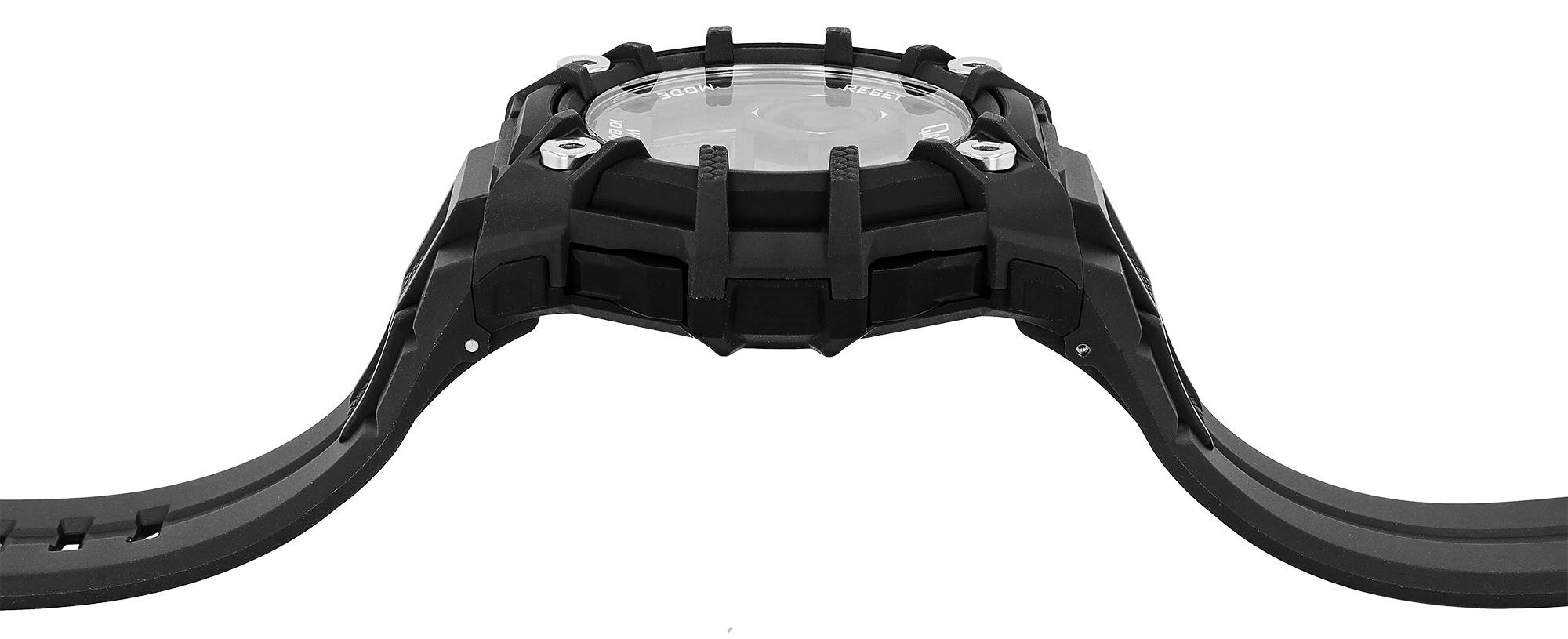 Het sportieve ontwerp van het horloge wordt gecompleteerd door vele modieuze details op de wijzerplaat, zoals de structuren die het horloge verdelen in een gedeelte met de dag van de week, datum en tijd, evenals een modieus rond element met een digitaal display in de linkerbovenhelft van de wijzerplaat.
