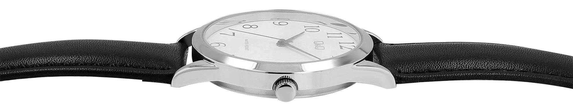 Dit polshorloge van Q&Q - by Citizen Watch Co. LTD heeft een waterdichtheid van 3 bar. Met een kastdiametervan 40 mm en een kasthoogte van 8 mm is het de perfecte maat om de aandacht te trekken zonder al te opdringerig te zijn. De brede band van 20 mm en de totale lengte van 25 cm maken het horloge geschikt voor de meeste polsen en de roestvrijstalen achterkant van de kast voegt stabiliteit en waarde toe. De zwarte Arabische cijfers en de effen wijzerplaat zorgen voor een uitstekende leesbaarheid.