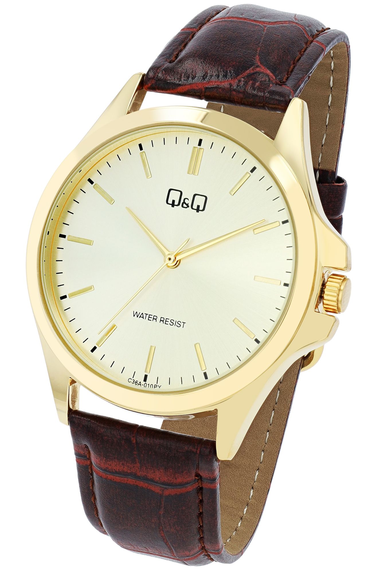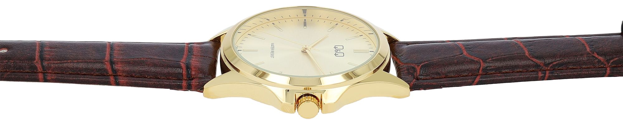 Dit eenvoudige herenpolshorloge met imitatieleren band is waterbestendig tot 3 bar en heeft een goudkleurige roestvrijstalen kast met een mineraalglazen kap, die een diameter van 4 cm heeft. De wijzerplaat is uitgevoerd in een elegante goudtint, met een goudkleurige streepindex en de typische 3-wijzers look van goede analoge horloges. De totale lengte van het horloge is 23,3 cm en de hoogte van de horlogekast is slechts 0,85 cm, dus dit horloge zit plat om de pols en is bijzonder comfortabel om te dragen dankzij de licht gevoerde bruine krokodillenleren band, die eindigt in een goudkleurige gesp die bij het horloge past. Eenvoudig en betrouwbaar, dit horloge met zijn hoogwaardige quartz uurwerk is de perfecte metgezel voor werk en vrije tijd.