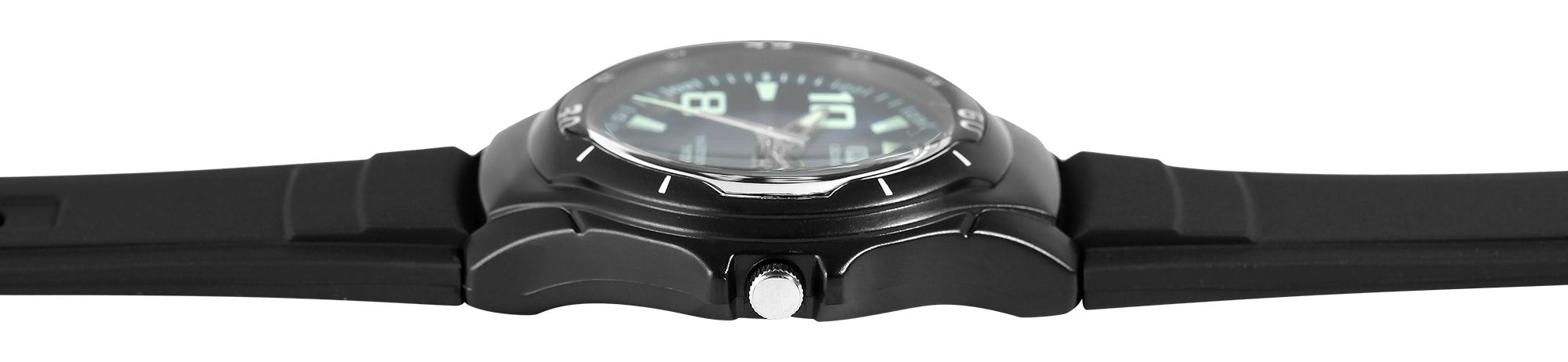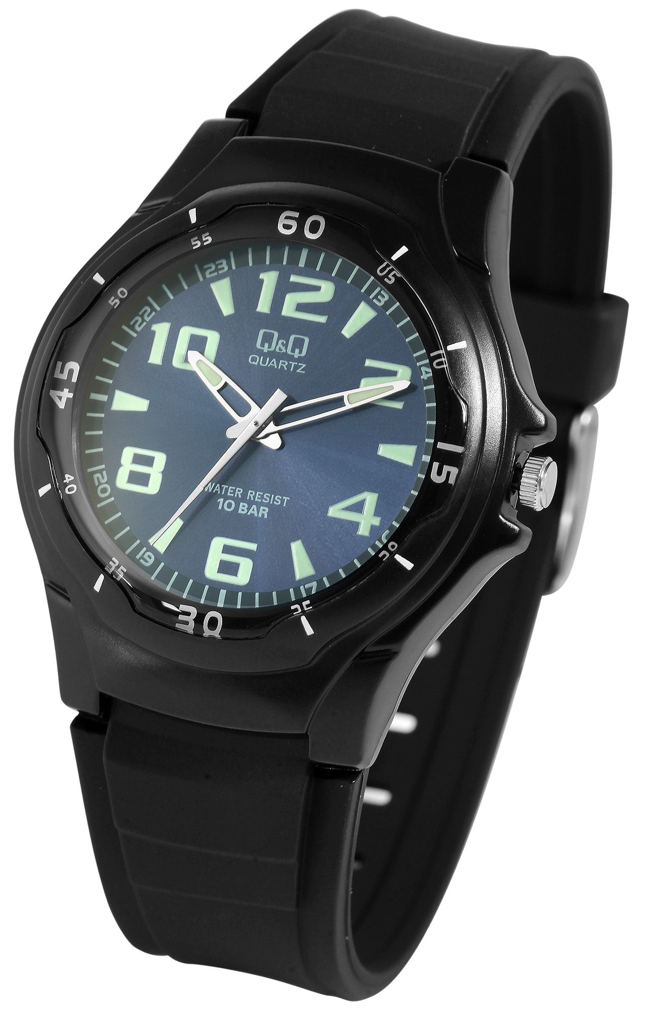 Het analoge 3-hands herenpolshorloge van het merk Q&Q - by Citizen Watch Co. LTD (by Citizen Watch Co. LTD) heeft een hoogwaardig quartz uurwerk. De zwarte harsband is 22 mm breed bij de lug (brugbreedte 16 mm) en kan worden geopend en gesloten met een zilverkleurige gesp. De totale lengte van het horloge is 23,5 cm. De zwarte kunststof kast met mineraalglas heeft een diameter van 40 mm en een kasthoogte van 12 mm. De achterkant van de kast is ook van kunststof. De wijzers en indexen zijn gecoat met Superluminova, waardoor je de tijd zelfs in het donker gemakkelijk kunt aflezen. Het horloge heeft een waterdichtheid van 10 bar.