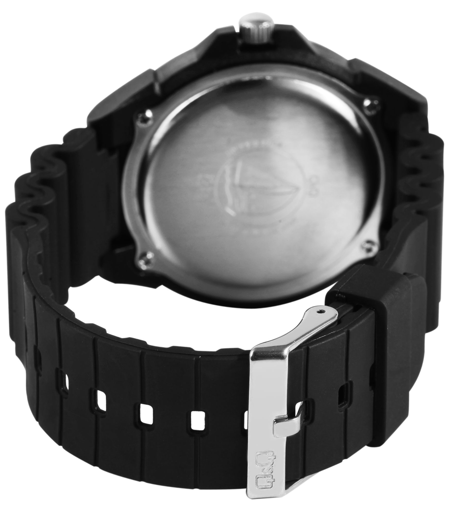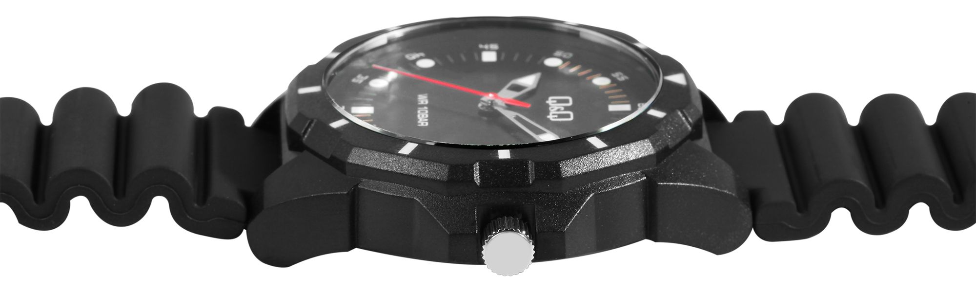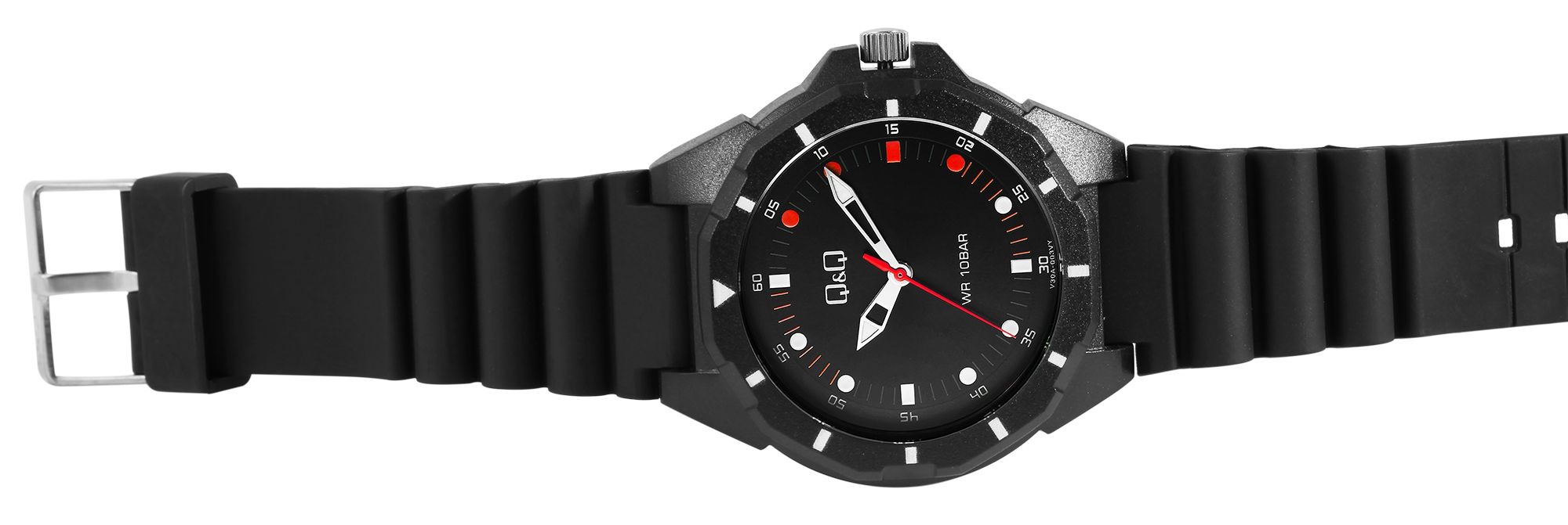 Het analoge 3-hands herenpolshorloge van het merk Q&Q - by Citizen Watch Co. LTD (by Citizen Watch Co. LTD) heeft een hoogwaardig en nauwkeurig quartz uurwerk. De zwarte harsband is 17 mm breed bij de lug (bandbreedte bij de brug 24 mm) en kan worden geopend en gesloten met een zilverkleurige roestvrijstalen gesp. De totale lengte van het horloge is 24,5 cm. De zwarte kunststof kast met mineraalglas en sportieve lunette heeft een diameter van 43 mm en een kasthoogte van 12 mm. De achterkant van de kast is gemaakt van roestvrij staal en is aan de kast bevestigd met vier roestvrijstalen schroeven. De duidelijk vormgegeven wijzerplaat met witte en rode indexen maakt het gemakkelijk om de tijd af te lezen. Verder is het polshorloge comfortabel om te dragen dankzij de resin band en kan het prachtig gecombineerd worden dankzij het sportieve ontwerp. Het materiaal is ook bijzonder huidvriendelijk, waardoor het ideaal is voor mensen met een allergie.