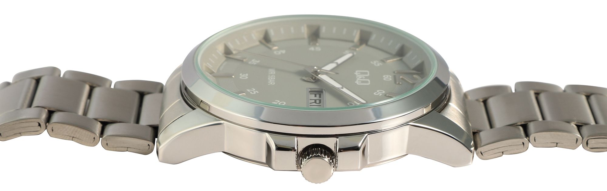Dit Q&Q - by Citizen Watch Co. LTD herenhorloge met roestvrijstalen armband, 5 ATM waterdichtheid en weekdag- en datumweergave is een veelzijdig accessoire dat indruk maakt met zijn functionaliteit en aantrekkelijke ontwerp. De robuuste maar stijlvolle roestvrijstalen schakelarmband biedt niet alleen een verfijnde look, maar ook duurzaamheid en draagcomfort. Hij kan worden ingekort voor een perfecte pasvorm en de hoogwaardige roestvrijstalen vouwsluiting zorgt ervoor dat hij veilig en gemakkelijk om- en afgedaan kan worden.