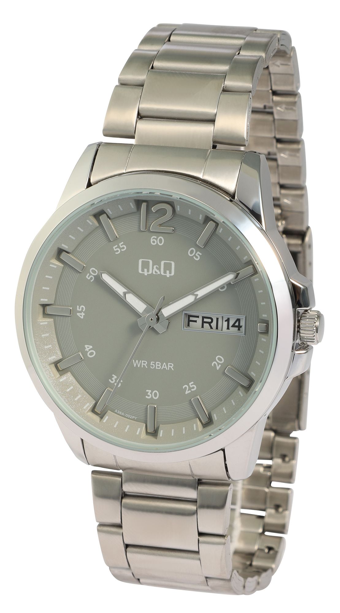 Productinformatie "Q&Q herenhorloge met roestvrijstalen armband, 5 ATM, Spaanse en Engelse weekdag- en datumweergave, zilver/ZB-grijs"