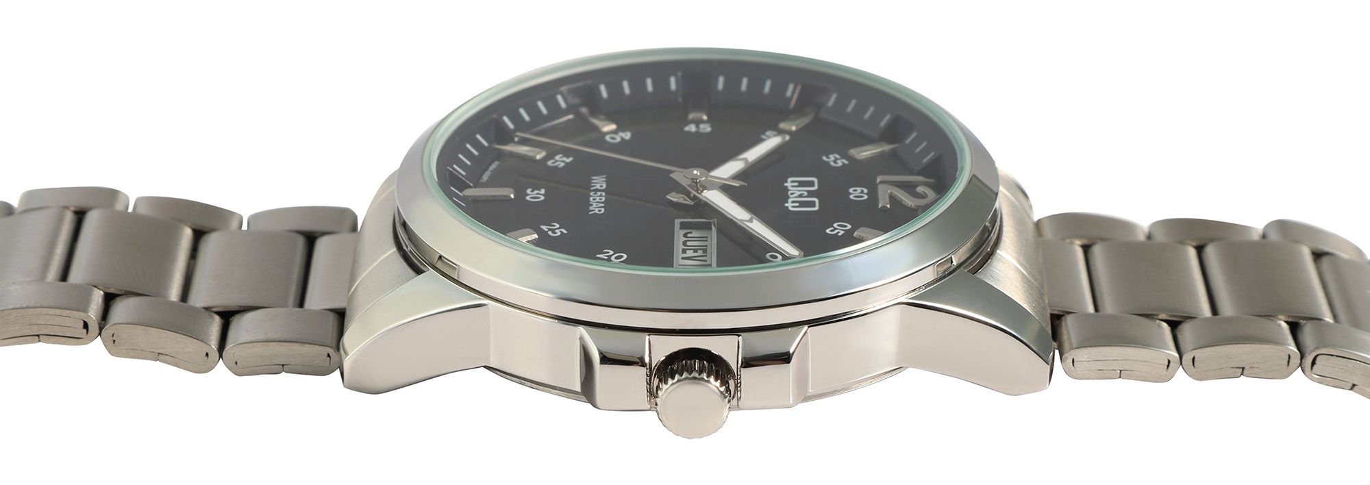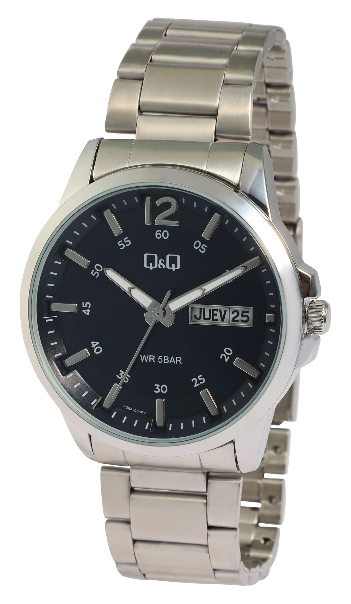Productinformatie "Q&Q herenhorloge met roestvrijstalen armband, 5 ATM, Spaanse en Engelse weekdag- en datumweergave, zilverkleurig/ZB donkerblauw"