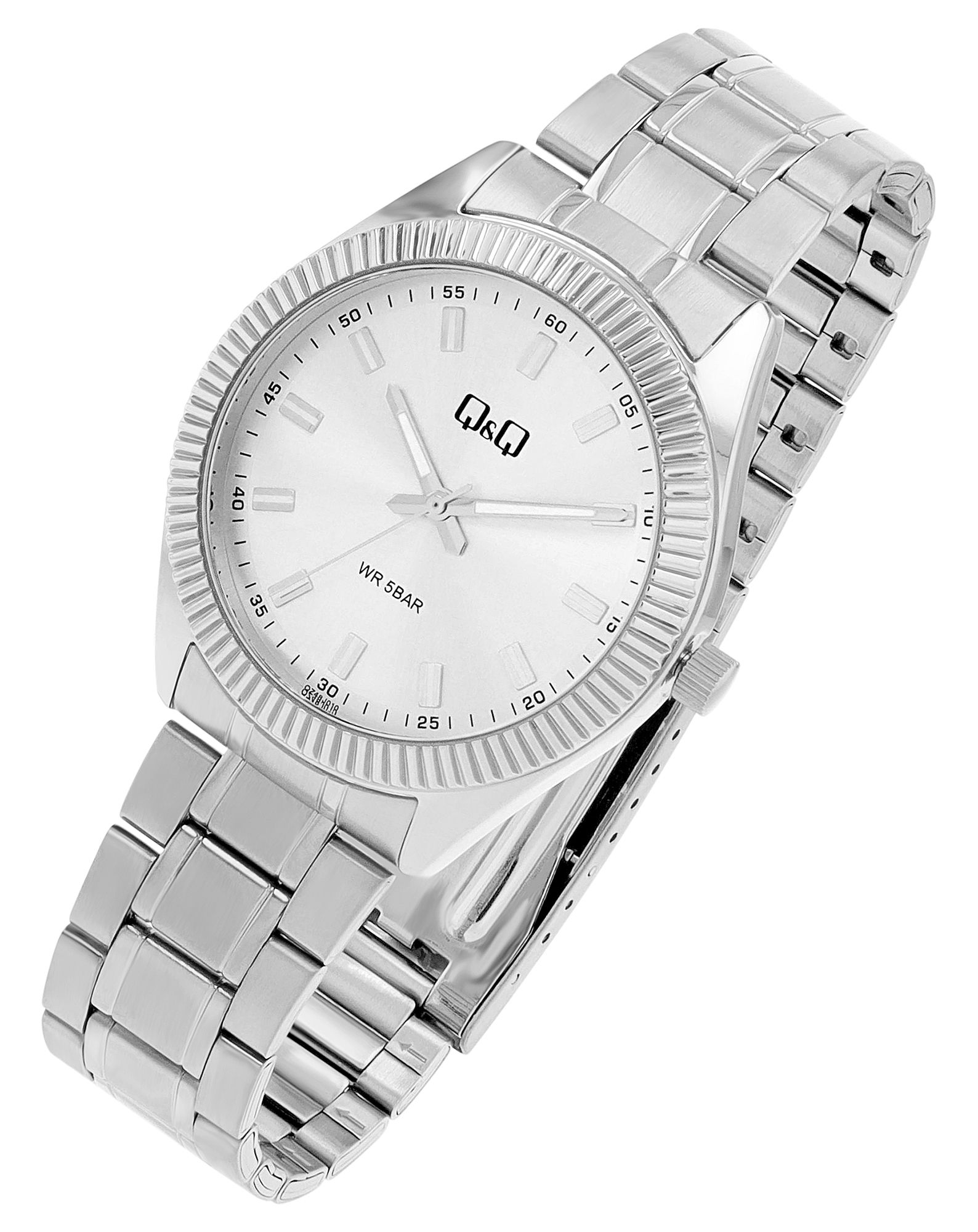 Het Q&Q - by Citizen Watch Co. LTD herenhorloge in zilverkleurig uiterlijk is niet alleen een decoratief accessoire. Het is een metgezel die perfect is uitgerust voor dagelijks gebruik. Met een indrukwekkende waterbestendigheid van 5 ATM is het bestand tegen spatwater en zelfs een korte onderdompeling. De Superluminova-gecoate wijzers en indexen zorgen ervoor dat de tijd moeiteloos kan worden afgelezen, zelfs in het donker.