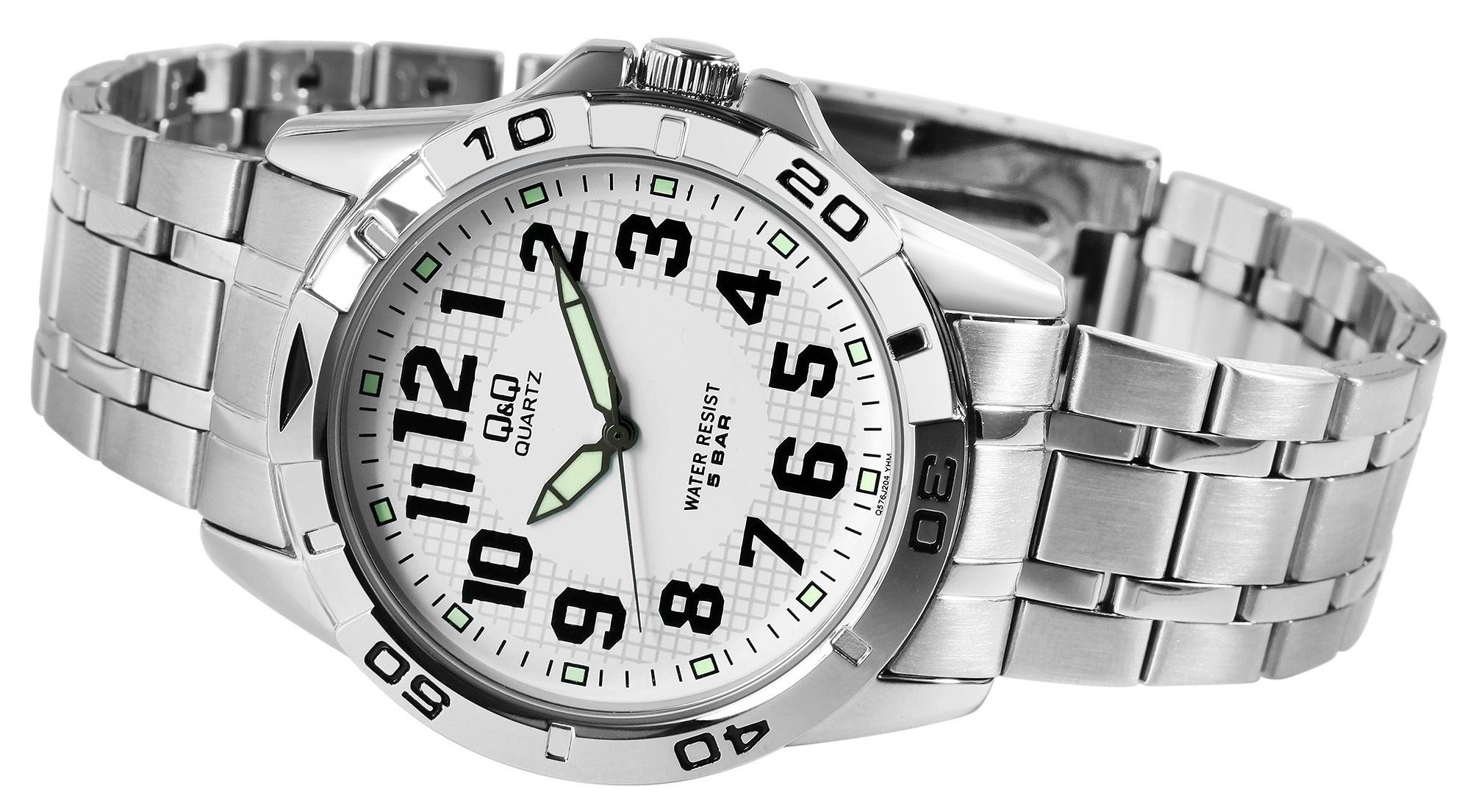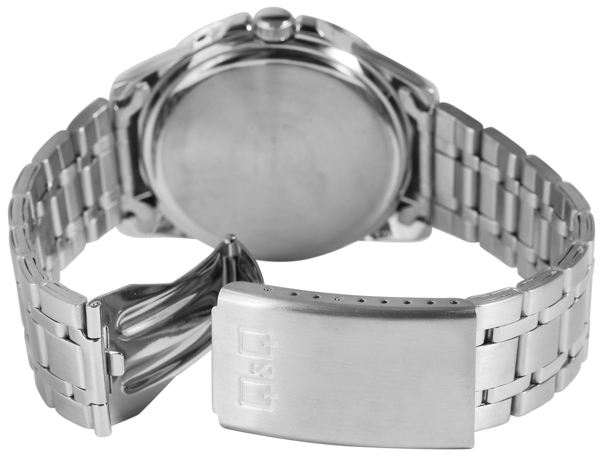 Het analoge herenpolshorloge met 3 wijzers van Q&Q - by Citizen Watch Co. LTD heeft een hoogwaardig en nauwkeurig quartz uurwerk. De zilverkleurige roestvrijstalen armband is 22 mm breed bij de lug en kan worden geopend en gesloten met een roestvrijstalen vouwsluiting. De horlogeband is bijzonder robuust en duurzaam en kan dankzij de afneembare elementen naar wens worden ingekort met een geschikt gereedschap. De combinatie van matte en glanzende horloge-elementen maakt het horloge tot een bijzonder accessoire. De totale lengte is 23 cm. De zilverkleurige horlogekast met mineraalglas heeft een diameter van 42 mm en een kasthoogte van 10 mm. De witte wijzerplaat met zwarte Arabische cijfers maakt het gemakkelijk om de tijd af te lezen. Dankzij de Superluminova-gecoate wijzers en indexen is dit ook mogelijk in het donker. De buitenste, geruite wijzerplaatring is een echte blikvanger. De achterkant van de kast is ook van roestvrij staal en het horloge heeft een waterdichtheid van 5 bar. Al met al is dit uurwerk een geslaagd en betrouwbaar accessoire dat bij talloze gelegenheden kan worden gedragen.