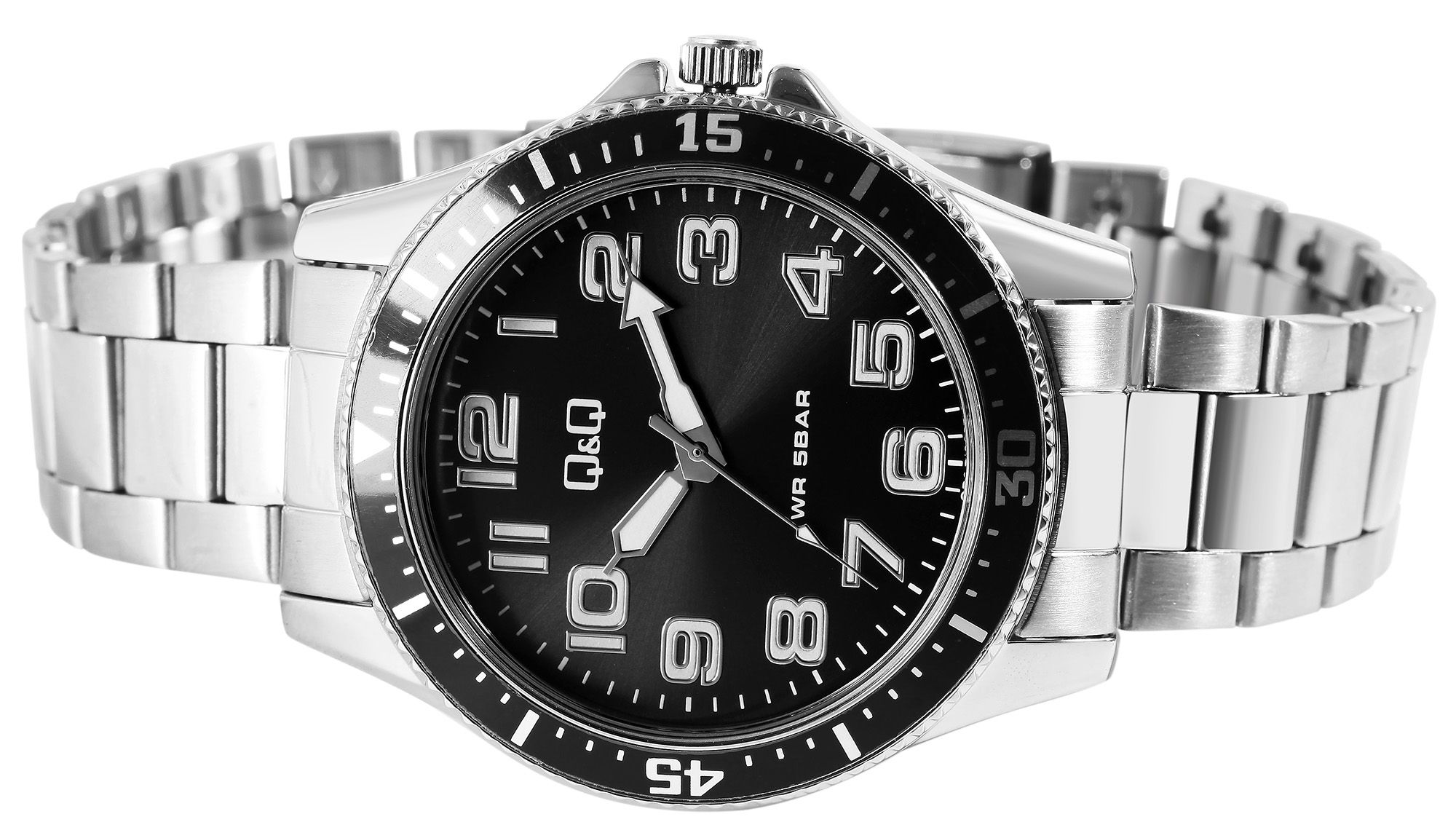 Het analoge herenpolshorloge met 3 wijzers van Q&Q - by Citizen Watch Co. LTD heeft een hoogwaardig en nauwkeurig quartz uurwerk. De zilverkleurige roestvrijstalen armband is 20 mm breed bij de lug en kan worden geopend en gesloten met een roestvrijstalen vouwsluiting. De horlogeband is bijzonder robuust en duurzaam en kan dankzij de afneembare elementen naar wens worden ingekort met een geschikt gereedschap. De combinatie van matte en glanzende horloge-elementen maakt het horloge tot een bijzonder accessoire. De totale lengte is 23 cm. De zilverkleurige horlogekast met mineraalglas heeft een diameter van 43 mm en een kasthoogte van 11,5 mm. De zwarte lunette geeft het horloge een sportief design. De antracietkleurige wijzerplaat met zilverkleurige Arabische cijfers maakt het gemakkelijk om de tijd af te lezen. Dankzij de Superluminova-gecoate wijzers en indexen is dit ook mogelijk in het donker. De achterkant van de kast is ook gemaakt van roestvrij staal en het horloge heeft een waterdichtheid van 5 bar. Al met al is dit uurwerk een succesvol en betrouwbaar accessoire dat bij talloze gelegenheden kan worden gedragen.