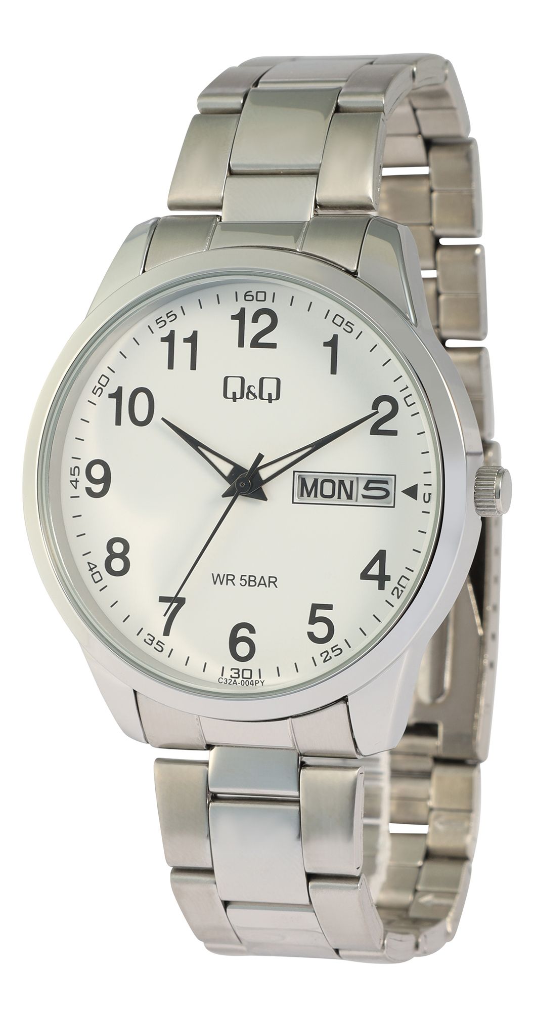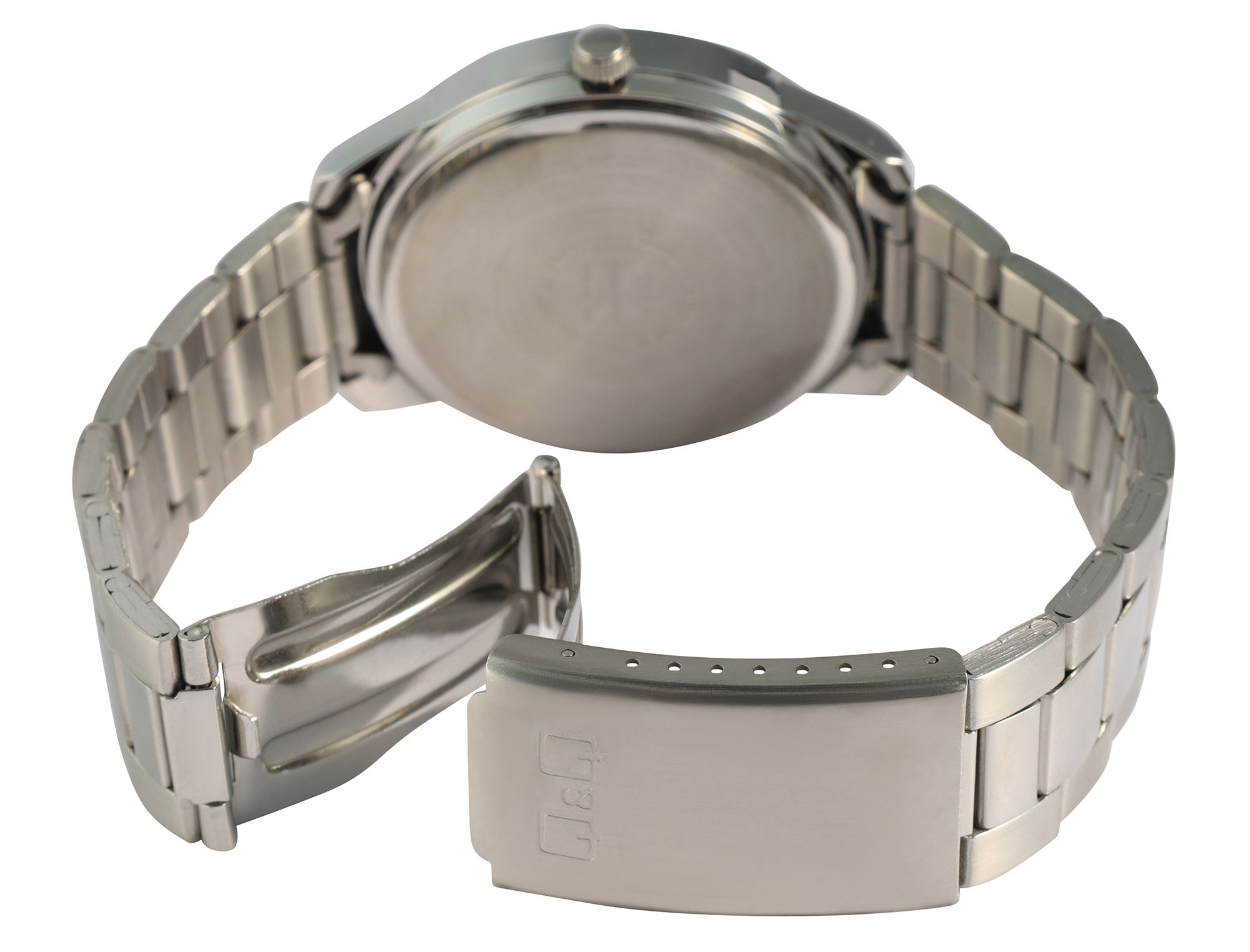 Laat je overtuigen door het stijlvolle design en de hoge functionaliteit van ons Q&Q - by Citizen Watch Co. LTD herenhorloge (by Citizen Watch & Co., LTD). Dit herenhorloge maakt indruk met een schakelarmband van hoogwaardig roestvrij staal, die glinstert in een combinatie van matte en gepolijste elementen in een zilveren kleur. De roestvrijstalen vouwsluiting zorgt voor een stevige grip en comfortabel dragen. De robuuste metalen kast heeft een diameter van 42 mm en een hoogte van 10 mm. De roestvrijstalen achterkant van de kast garandeert extra duurzaamheid. Het mineraalglas beschermt de wijzerplaat betrouwbaar tegen krassen en stoten.