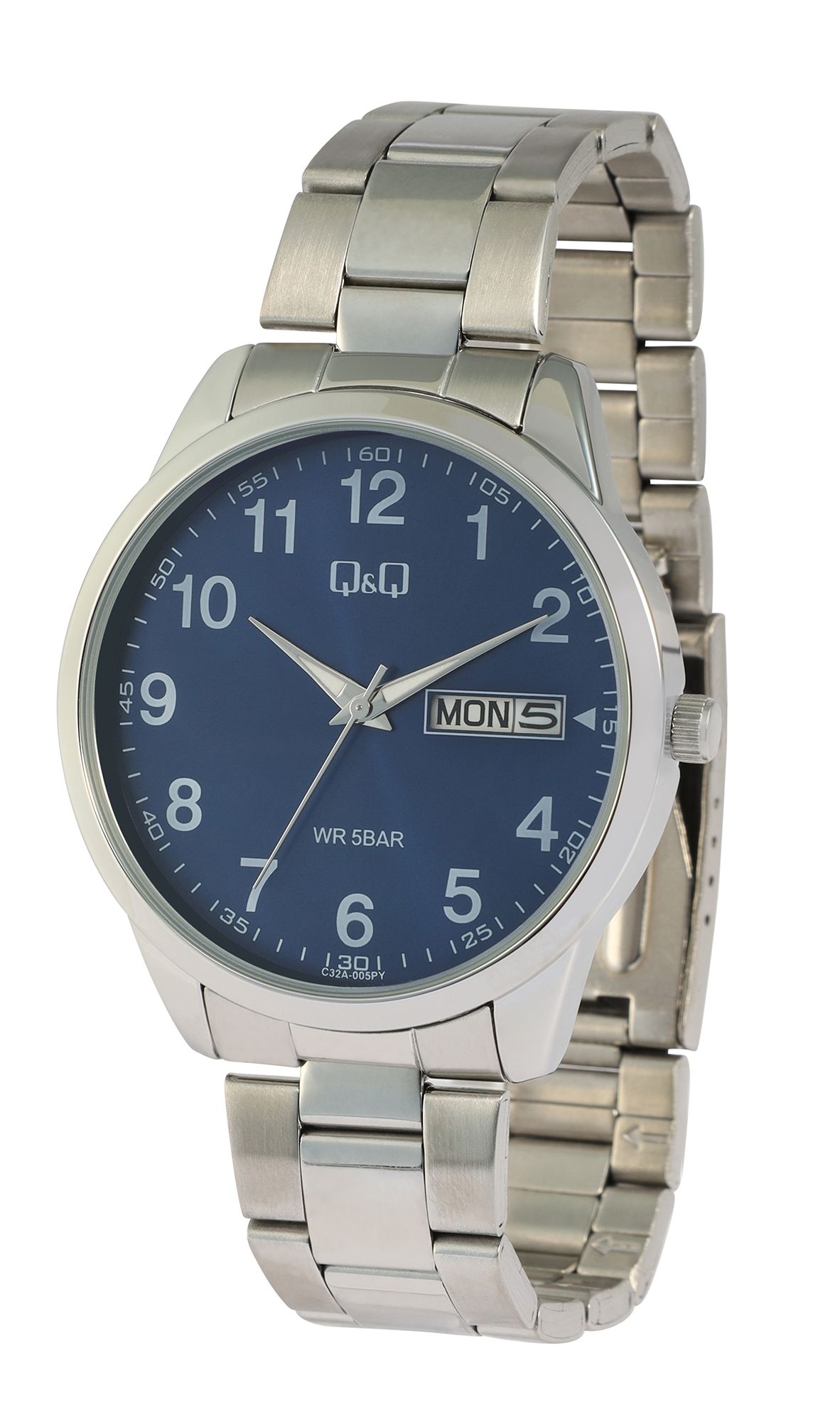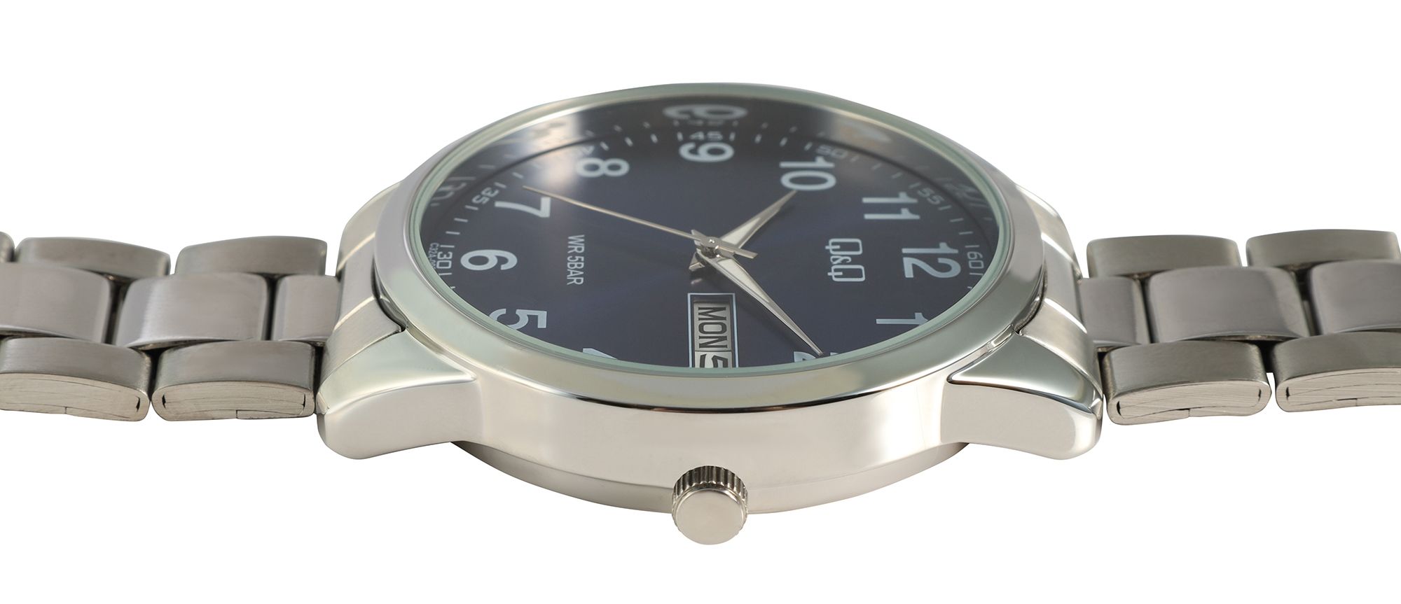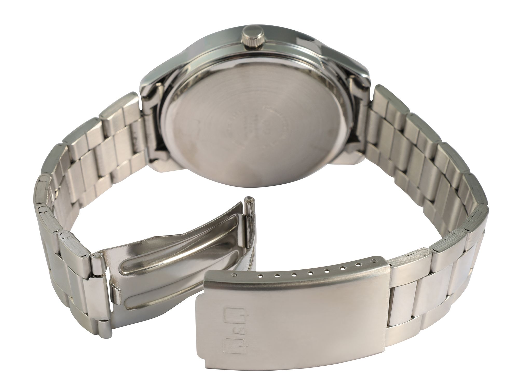 Laat je overtuigen door het stijlvolle design en de hoge functionaliteit van ons Q&Q - by Citizen Watch Co. LTD herenhorloge (by Citizen Watch & Co., LTD). Dit herenhorloge maakt indruk met een schakelarmband van hoogwaardig roestvrij staal, die glinstert in een combinatie van matte en gepolijste elementen in een zilveren kleur. De roestvrijstalen vouwsluiting zorgt voor een stevige grip en comfortabel dragen. De robuuste metalen kast heeft een diameter van 42 mm en een hoogte van 10 mm. De roestvrijstalen achterkant van de kast garandeert extra duurzaamheid. Het mineraalglas beschermt de wijzerplaat betrouwbaar tegen krassen en stoten.