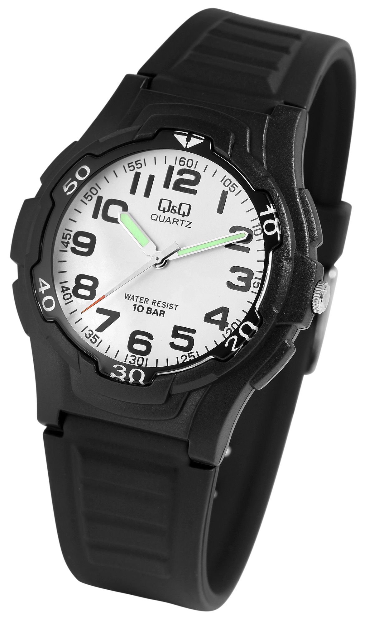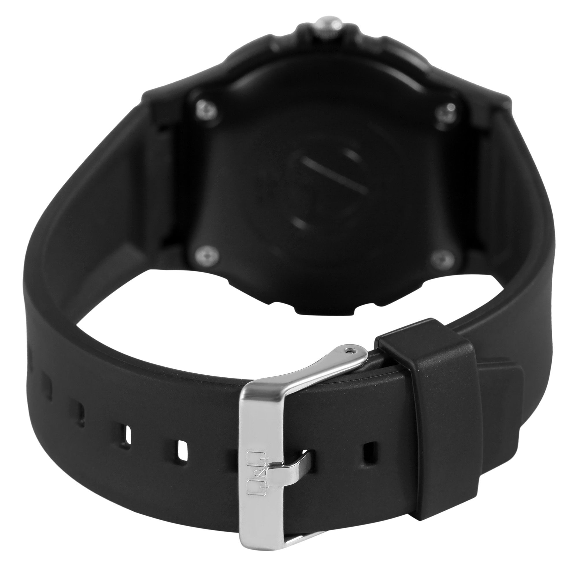 Het analoge herenpolshorloge met 3 wijzers van Q&Q - by Citizen Watch Co. LTD heeft een hoogwaardig kwartsuurwerk. De zwarte siliconen band is 23 mm breed bij de lug (brugbreedte 17 mm) en kan worden geopend en gesloten met een zilverkleurige gesp. De totale lengte van het horloge is 24,5 cm. De zwarte kunststof kast met mineraalglas heeft een diameter van 40 mm en een kasthoogte van 12 mm. De achterkant van de kast is ook van kunststof. De wijzers zijn voorzien van Superluminova, waardoor je de tijd zelfs in het donker gemakkelijk kunt aflezen. Het horloge heeft een waterdichtheid van 10 bar.