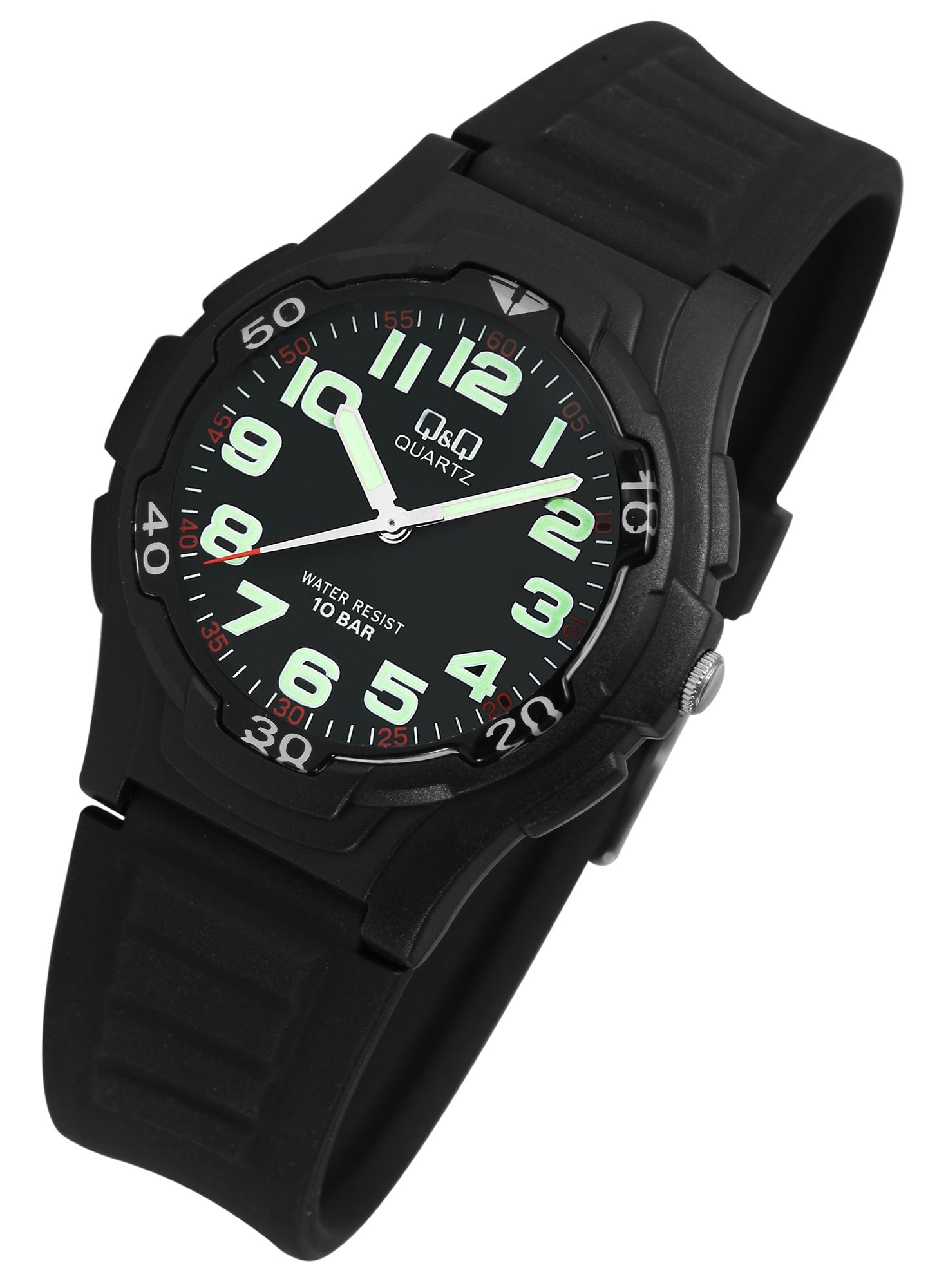 Het analoge herenpolshorloge met 3 wijzers van het merk Q&Q heeft een hoogwaardig kwartsuurwerk. De zwarte siliconen band is 23 mm breed bij de lug (brugbreedte 17 mm) en kan worden geopend en gesloten met een zilverkleurige gesp. De totale lengte van het horloge is 24,5 cm. De zwarte kunststof kast met mineraalglas heeft een diameter van 40 mm en een kasthoogte van 12 mm. De achterkant van de kast is ook van kunststof. De wijzers en indexen zijn gecoat met Superluminova, waardoor je de tijd zelfs in het donker gemakkelijk kunt aflezen. Het horloge heeft een waterdichtheid van 10 bar.