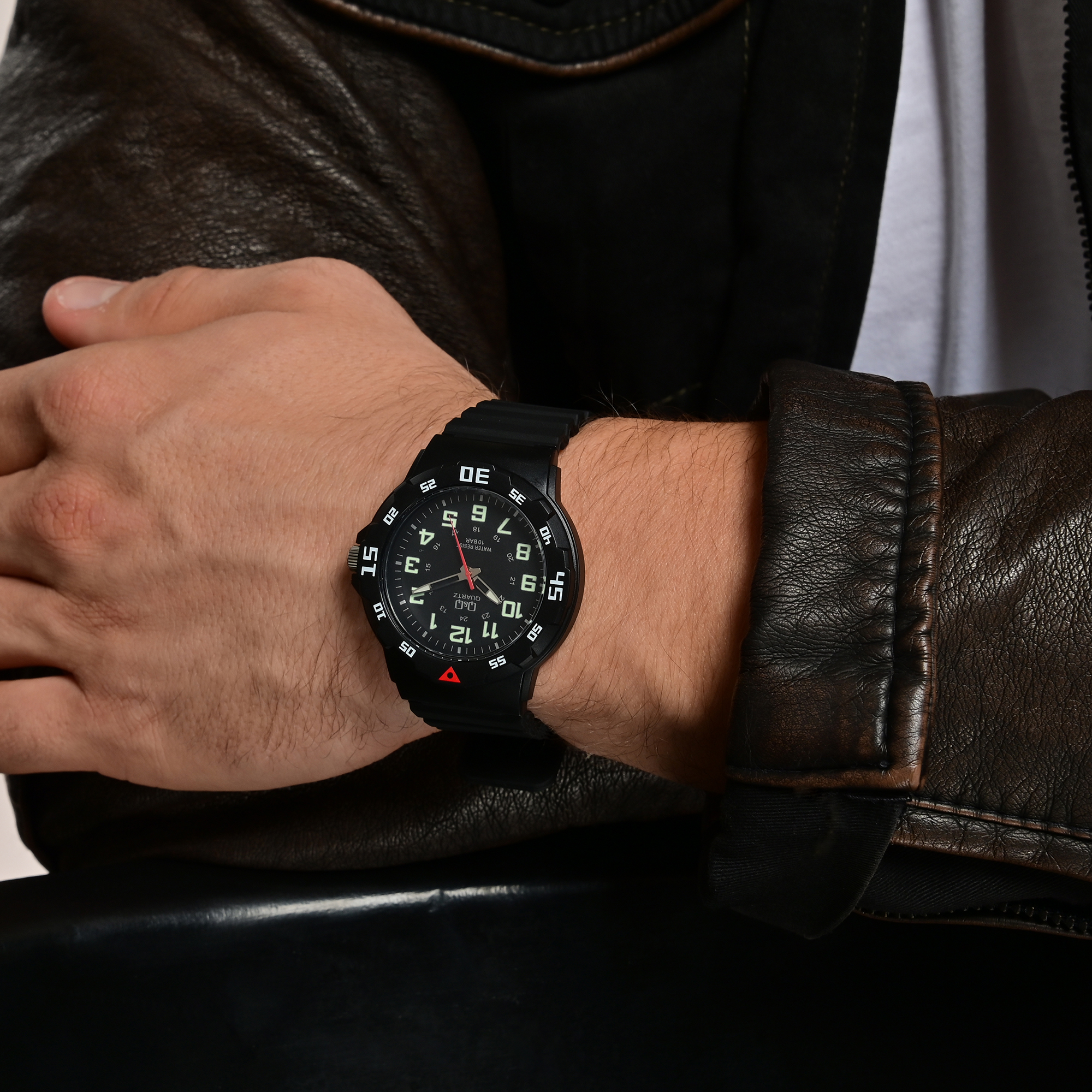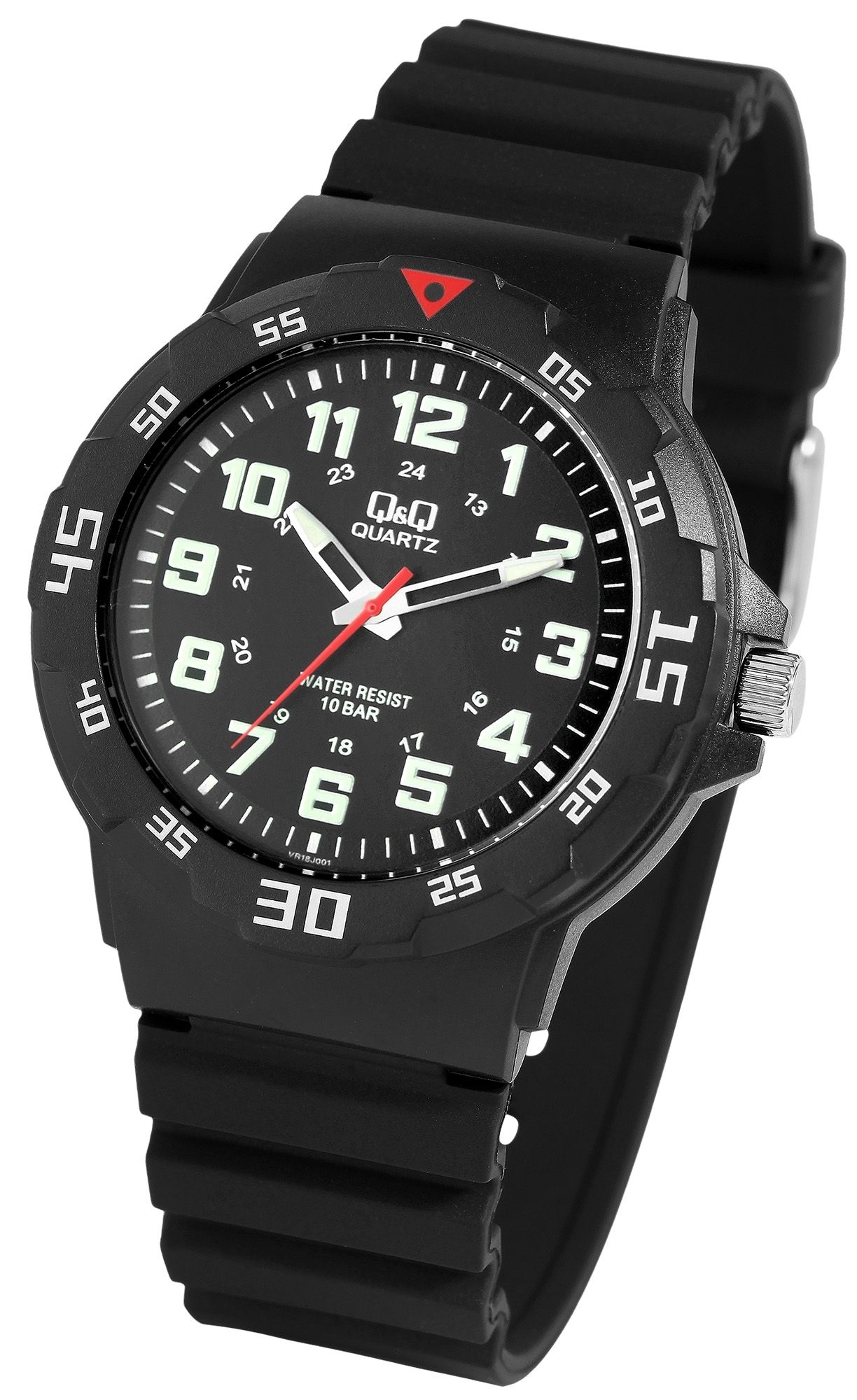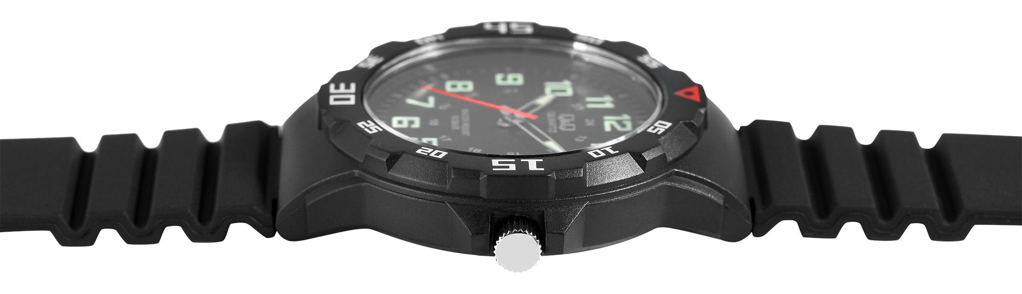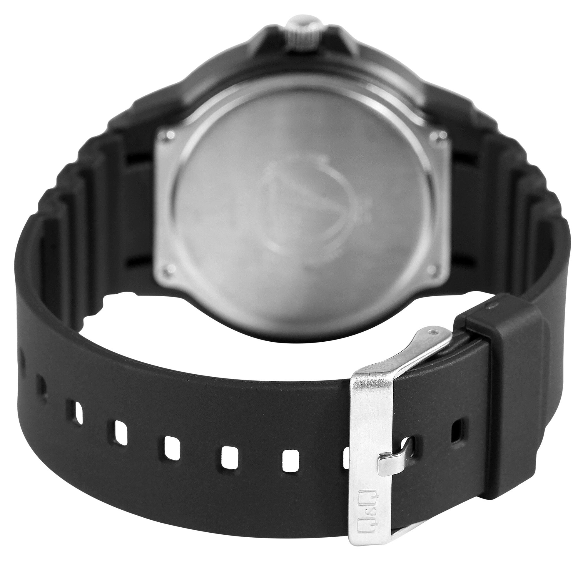 Het analoge 3-hands herenpolshorloge van het merk Q&Q - by Citizen Watch Co. LTD (by Citizen Watch Co. LTD) heeft een hoogwaardig quartz uurwerk. De zwarte siliconen band is 16 mm breed bij de brug (bandbreedte 22 mm) en kan worden geopend en gesloten met een zilverkleurige gesp. De totale lengte van het horloge is 25 cm. De zwarte kunststof kast met mineraalglas heeft een diameter van 43 mm en een kasthoogte van 11 mm. De achterkant van de kast is gemaakt van roestvrij staal. De wijzers en indexen zijn gecoat met Superluminova, waardoor je de tijd zelfs in het donker gemakkelijk kunt aflezen. Het horloge heeft een waterdichtheid van 10 bar.