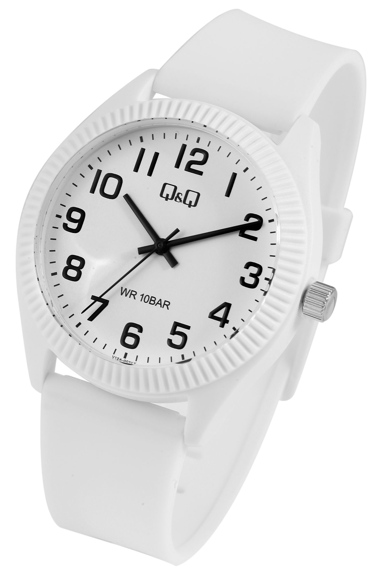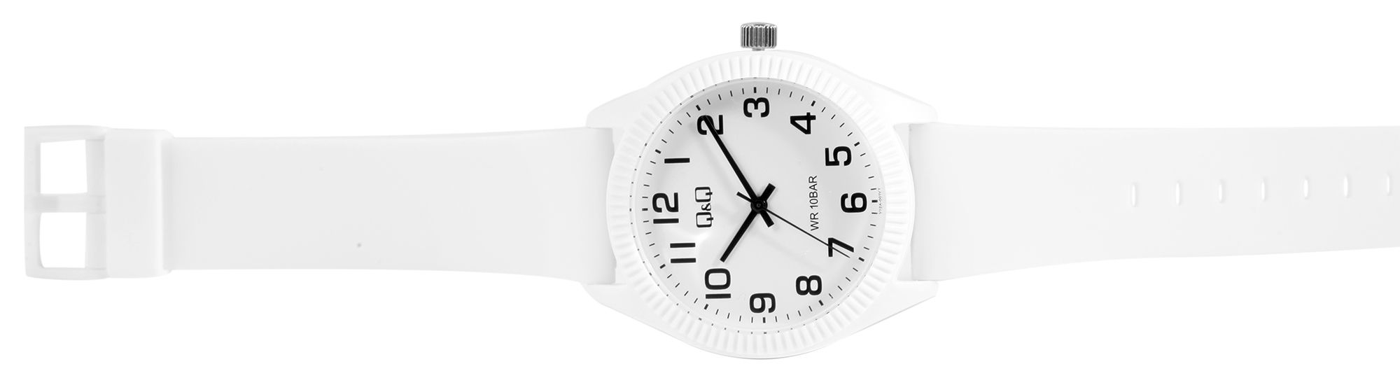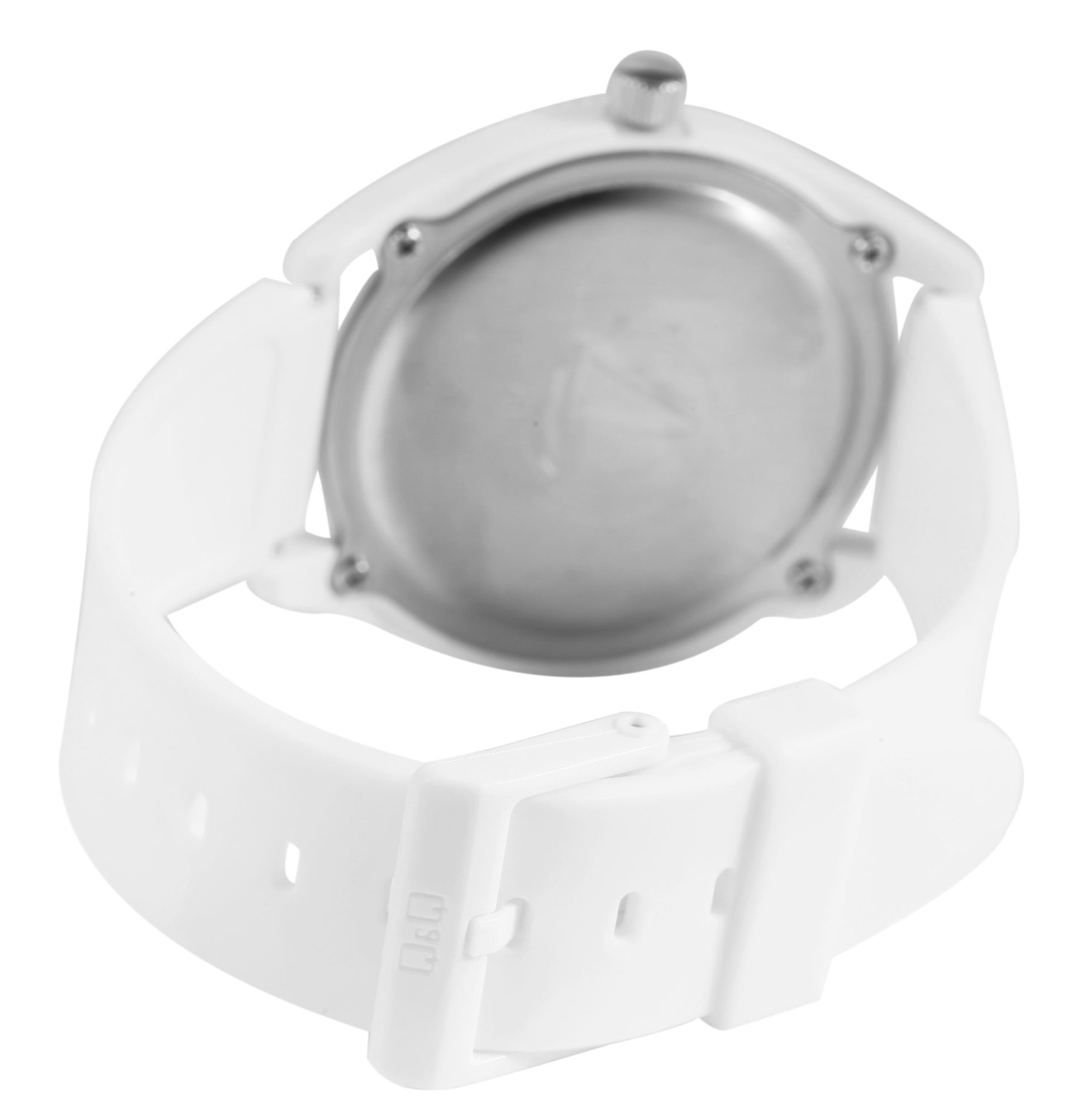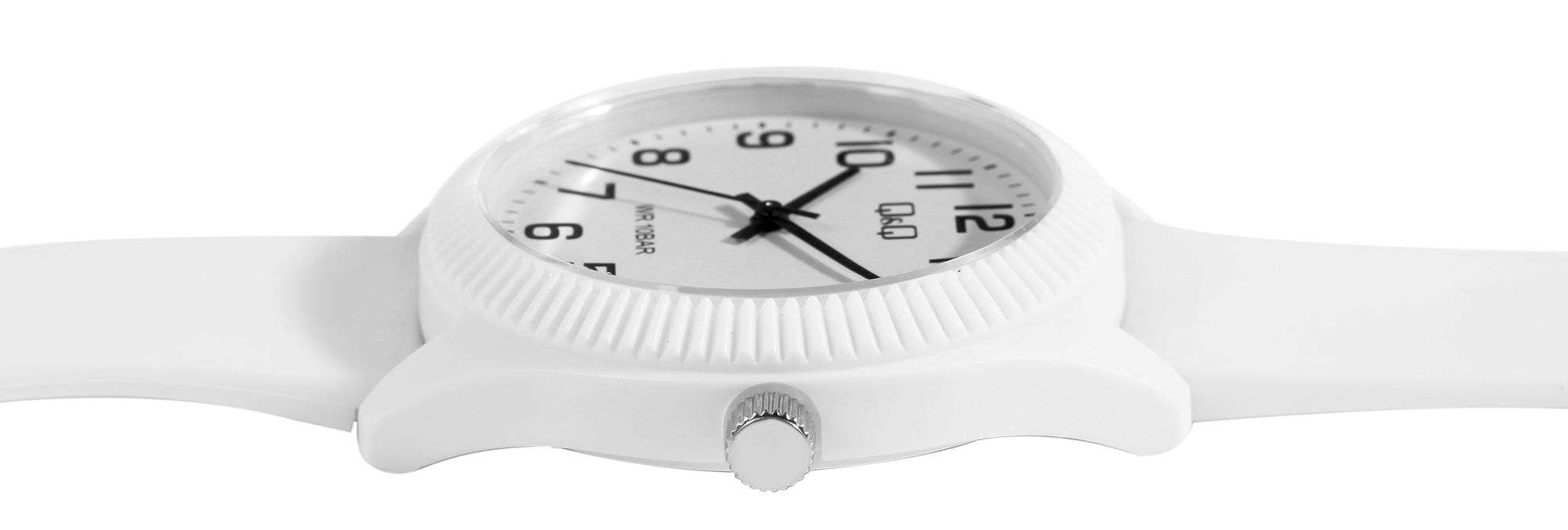 Het analoge herenhorloge met 3 wijzers van Q&Q - by Citizen Watch Co. LTD heeft een hoogwaardig en nauwkeurig kwartsuurwerk. De witte siliconen band is 21 mm breed bij de lug en kan worden geopend en gesloten met een witte gesp. De totale lengte van het horloge is 25 cm. De witte kunststof kast met mineraalglas heeft een diameter van 41 mm en een kasthoogte van 11 mm. De achterkant van de kast is gemaakt van roestvrij staal en is aan de kast bevestigd met vier roestvrijstalen schroeven. De witte wijzerplaat met zwarte Arabische cijfers maakt het gemakkelijk om de tijd af te lezen. Het polshorloge is ook comfortabel om te dragen dankzij de zachte siliconen band en kan prachtig worden gecombineerd met het sportieve ontwerp. Het materiaal is ook bijzonder huidvriendelijk, waardoor het ideaal is voor mensen met een allergie.