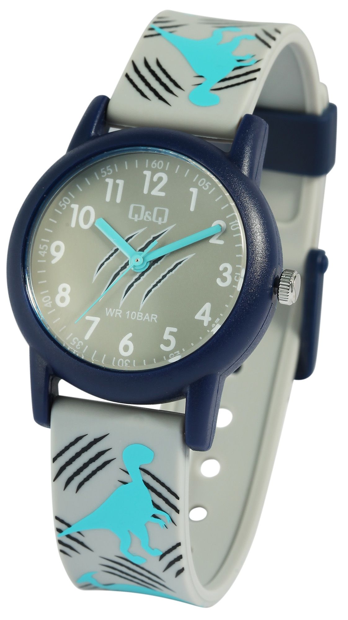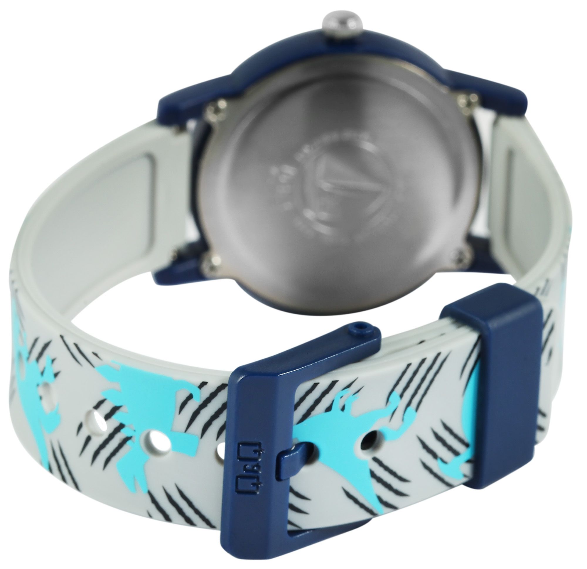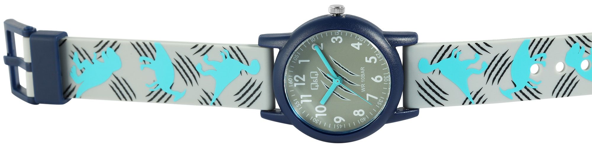 Het analoge 3-hands kinderpolshorloge van Q&Q - by Citizen Watch Co. LTD heeft een hoogwaardig quartz uurwerk. De grijze siliconen band is 16 mm breed bij de lug en kan worden geopend en gesloten met een blauwe kunststof gesp. De totale lengte van het horloge is 22,5 cm. De blauwe kunststof kast met kunststof kristal heeft een diameter van 32 mm en een kasthoogte van 10 mm. De achterkant van de kast is gemaakt van roestvrij staal. De siliconen band is versierd met dinosaurussen en is comfortabel om te dragen. Het is ook extreem duurzaam. De witte Arabische cijfers en de lichtblauwe wijzers op de grijze wijzerplaat maken het aflezen van de tijd kinderspel. Dit horloge is een leuke manier voor kinderen om te leren klokkijken en tovert een glimlach op het gezicht van de kleine drager.