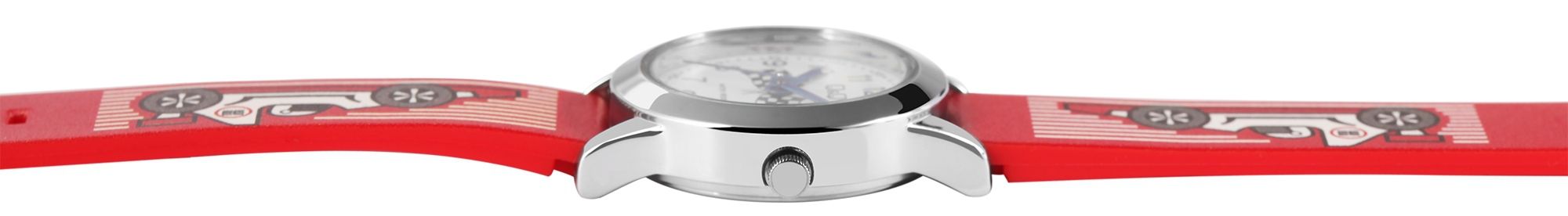 Het analoge 3-hands kinderpolshorloge van Q&Q - by Citizen Watch Co. LTD heeft een hoogwaardig quartz uurwerk. De rode kunststof band is 12 mm breed bij de lug en kan worden geopend en gesloten met een zilverkleurige gesp. De totale lengte van het horloge is 22,5 cm. De zilverkleurige metalen kast met mineraalglas heeft een diameter van 25 mm en een kasthoogte van 7,5 mm. De achterkant van de kast is gemaakt van roestvrij staal. De rode kunststof band is versierd met verschillende motieven in de vorm van kleine raceauto's en is comfortabel om te dragen. De wijzerplaat is wit en bedrukt met blauwe cijfers. De drie wijzers zijn ook blauw en passen perfect bij de lay-out van de wijzerplaat. De motieven op de band komen ook terug op de wijzerplaat. Het horloge heeft ook een waterbestendigheid van 3 bar.