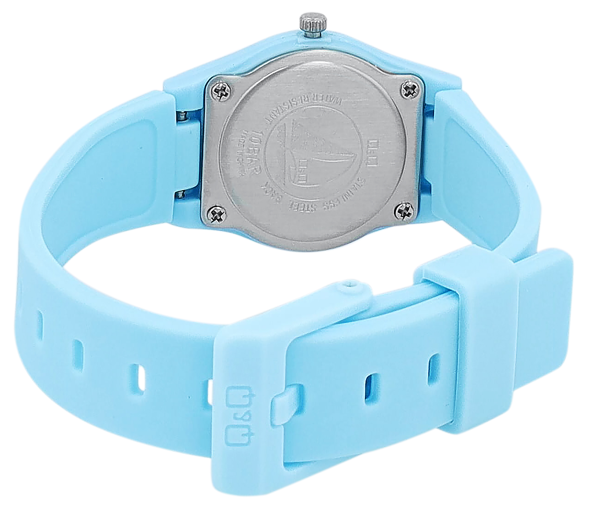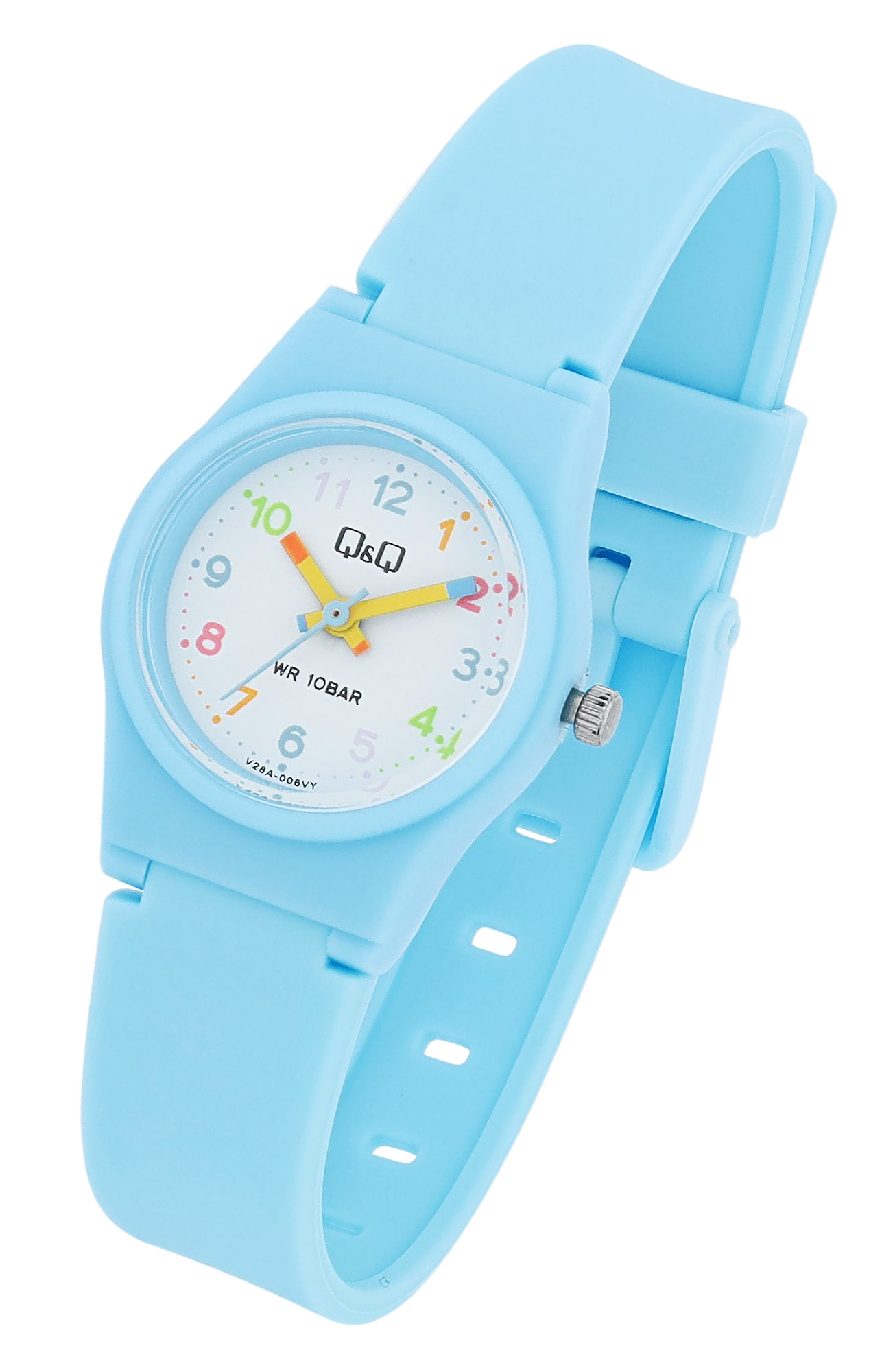 Het analoge 3-hands kinderpolshorloge van Q&Q - by Citizen Watch Co. LTD heeft een hoogwaardig quartz uurwerk. De lichtblauwe siliconen band is 14 mm breed bij de lug en kan worden geopend en gesloten met een kunststof gesp in dezelfde kleur. De totale lengte van het horloge is 22 cm. De lichtblauwe kunststof kast met kunststof kristal heeft een diameter van 25 mm en een kasthoogte van 9 mm. De achterkant van de kast is gemaakt van roestvrij staal. De veelkleurige Arabische cijfers en kleurrijke wijzers maken het aflezen van de tijd kinderspel. Dit uurwerk is een leuke manier voor kinderen om te leren klokkijken en tovert een glimlach op de gezichten van de kleine dragers.