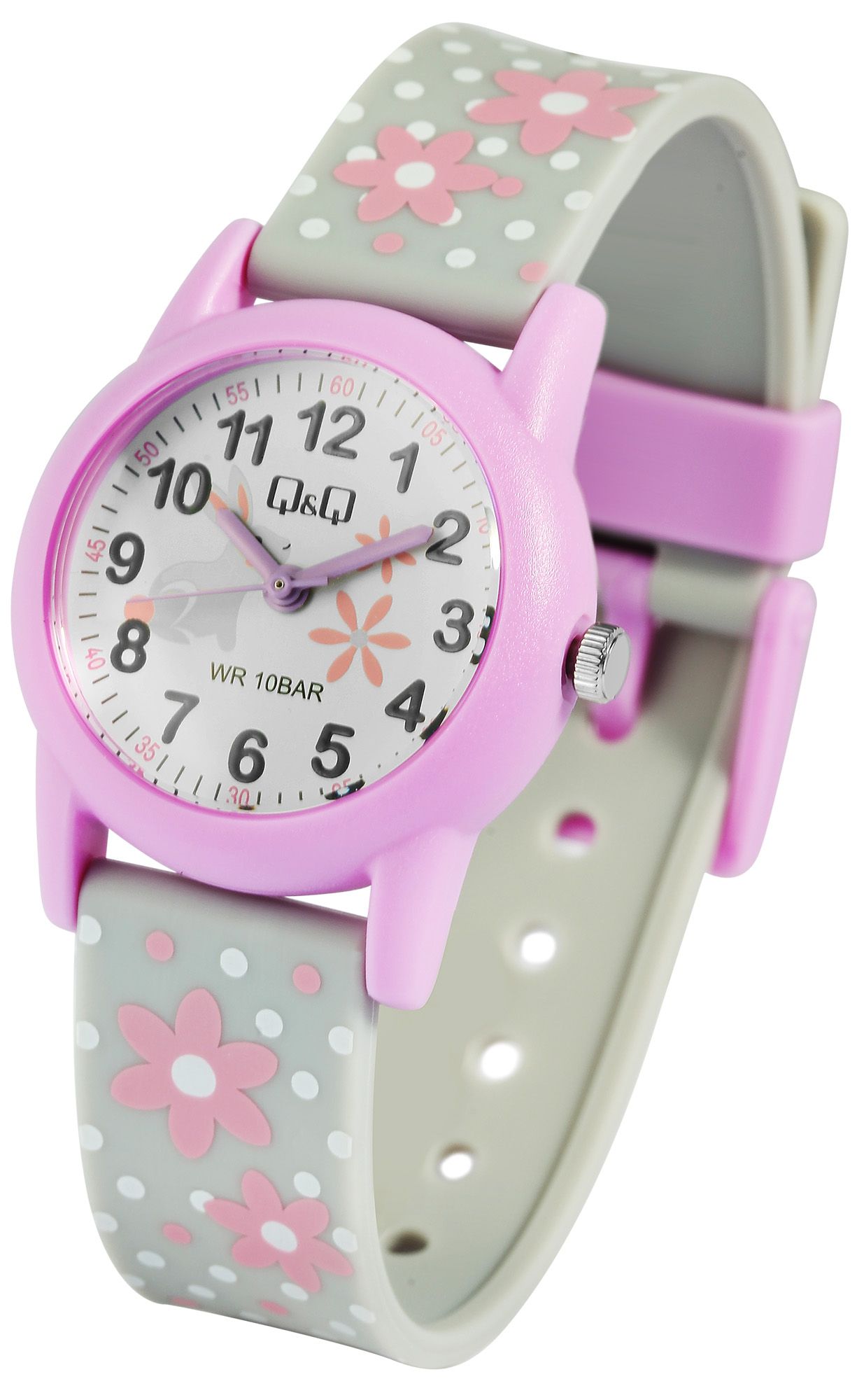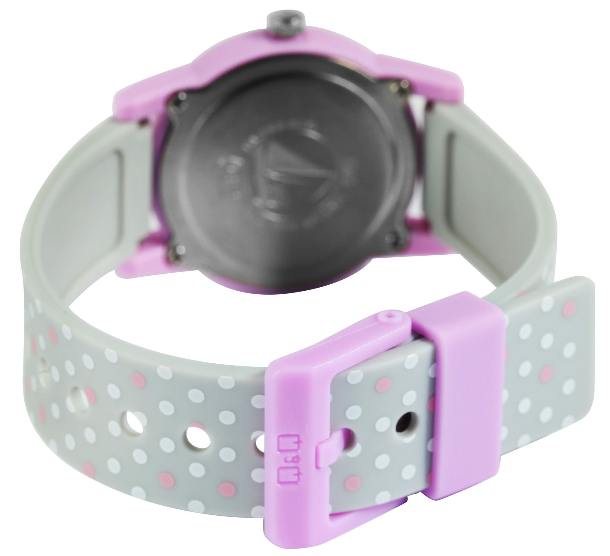 Het analoge 3-hands kinderpolshorloge van Q&Q - by Citizen Watch Co. LTD heeft een hoogwaardig quartz uurwerk. De grijze siliconen band is 16 mm breed bij de lug en kan worden geopend en gesloten met een paarse kunststof gesp. De totale lengte van het horloge is 22,5 cm. De paars gekleurde kunststof kast met kunststof kristal heeft een diameter van 30 mm en een kasthoogte van 10 mm. De achterkant van de kast is gemaakt van roestvrij staal. De siliconen band is versierd met bloemmotieven en stippen en is comfortabel om te dragen. Het is ook extreem duurzaam. De bloemen komen ook terug op de wijzerplaat. De zwarte Arabische cijfers en paarse wijzers op de witte wijzerplaat maken het aflezen van de tijd kinderspel. Dit meisjesachtige model helpt kinderen op een leuke manier de tijd te leren aflezen en tovert een glimlach op het gezicht van de kleine draagsters.