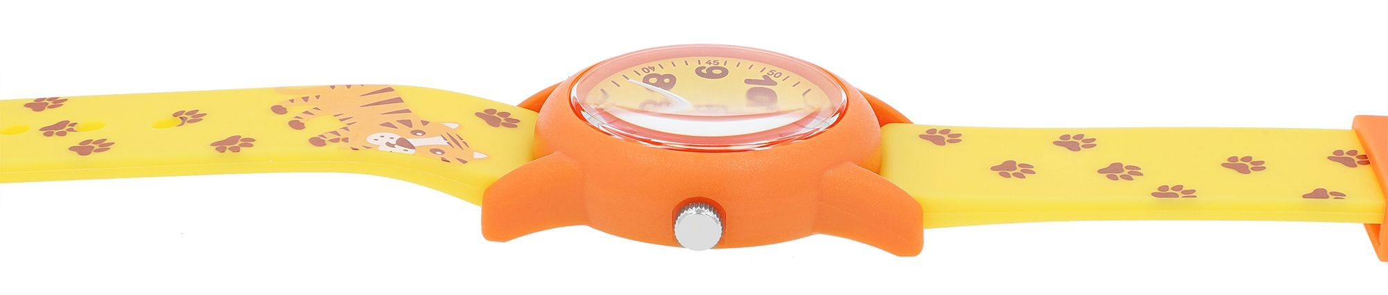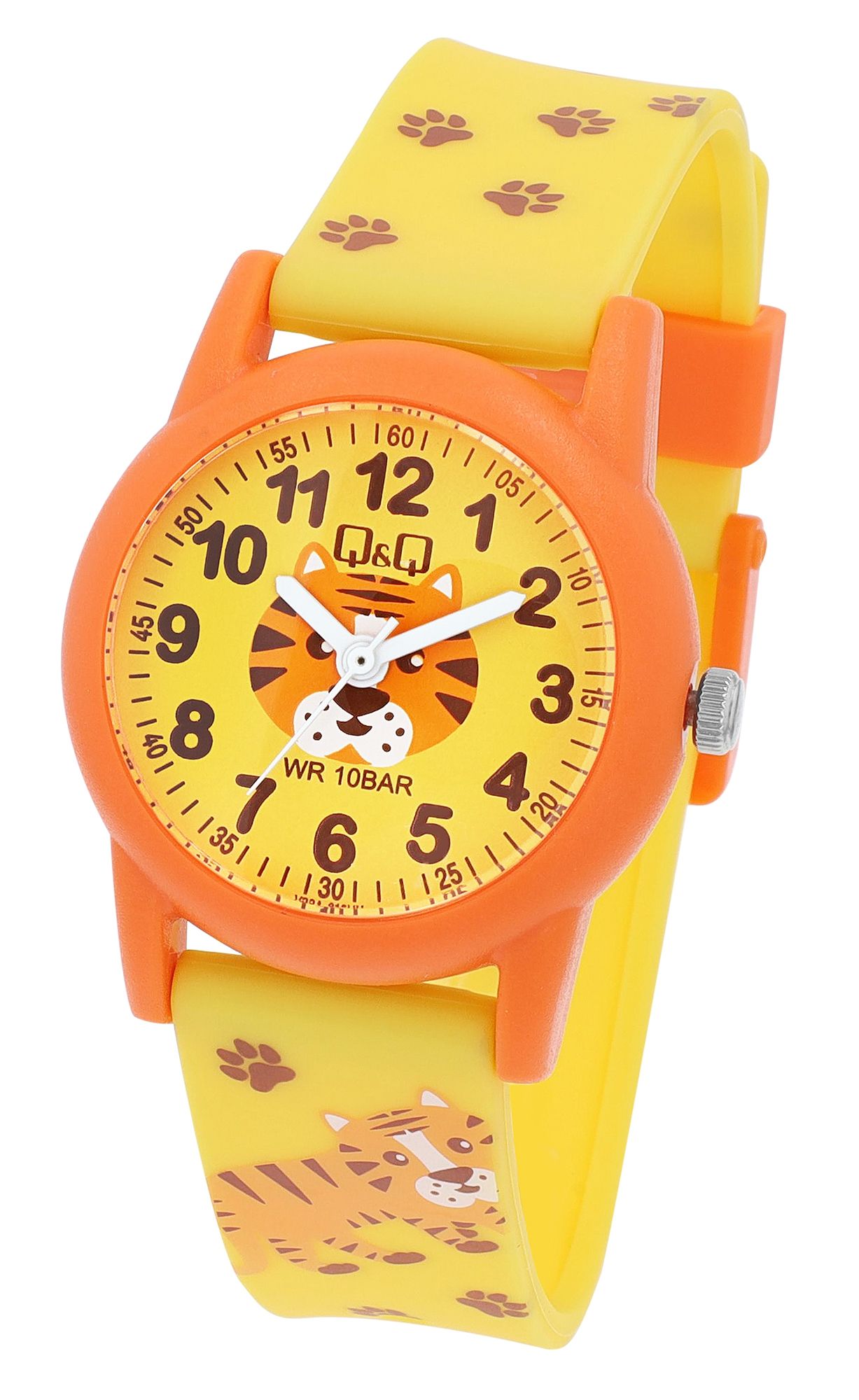 Ontdek de spannende wereld van de tijdmeting met ons Q&Q - by Citizen Watch Co. LTD kinderhorloge, dat kleintjes niet alleen helpt de tijd bij te houden, maar ook een glimlach op hun gezicht tovert. Dit analoge horloge met 3 wijzers is een echte blikvanger. De band van het horloge is versierd met speelse tijger- en pootmotieven. De combinatie van gele en oranje tinten gaat naadloos over in het schattige dierendesign en geeft het horloge een spannende en kindvriendelijke uitstraling.