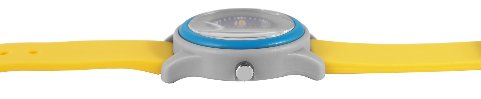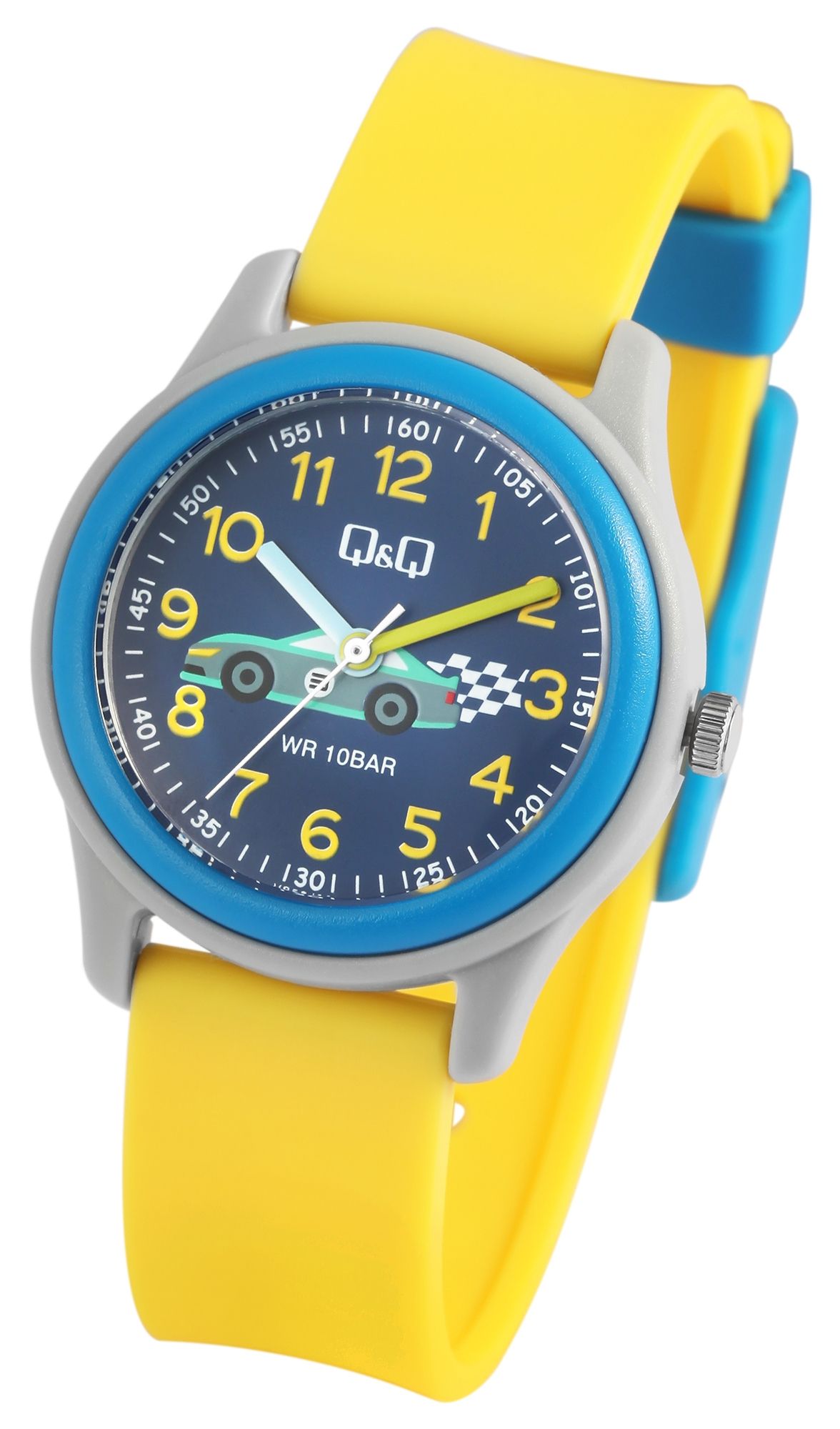 Het analoge 3-hands kinderpolshorloge van Q&Q - by Citizen Watch Co. LTD heeft een hoogwaardig quartz uurwerk. De gele siliconen band is 16 mm breed bij de lug en kan worden geopend en gesloten met een blauwe kunststof gesp. Dankzij het materiaal is het horloge niet alleen robuust, maar ook comfortabel om te dragen. De totale lengte van het horloge is 22,5 cm. De grijze kunststof kast met kunststof kristal heeft een diameter van 32 mm en een kasthoogte van 10 mm. De achterkant van de kast is gemaakt van roestvrij staal. De wijzerplaat is blauw en bedrukt met gele cijfers. De drie wijzers zijn in verschillende kleuren. Op de wijzerplaat is ook een raceauto afgebeeld. Het horloge heeft ook een waterdichtheid van 10 bar.