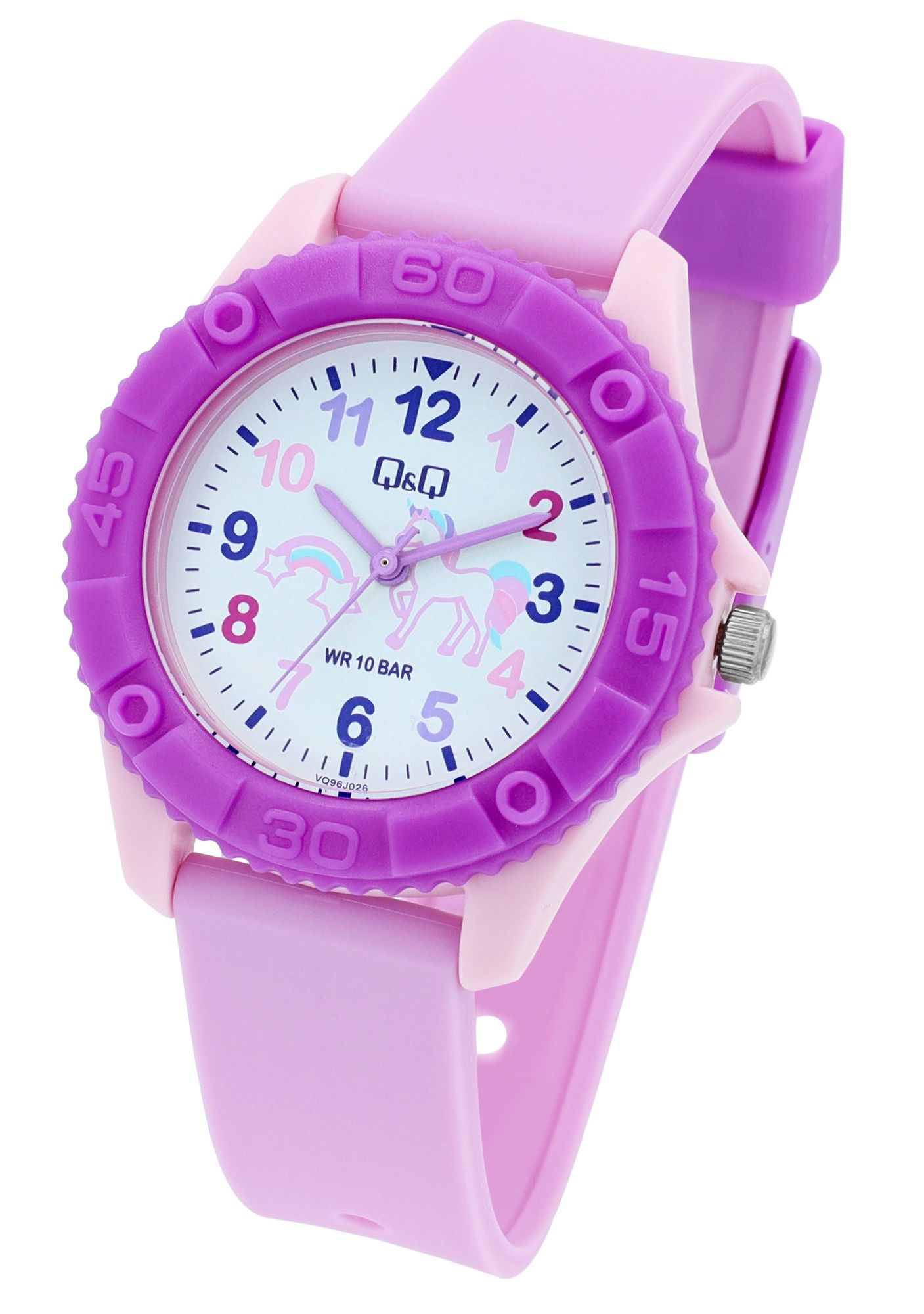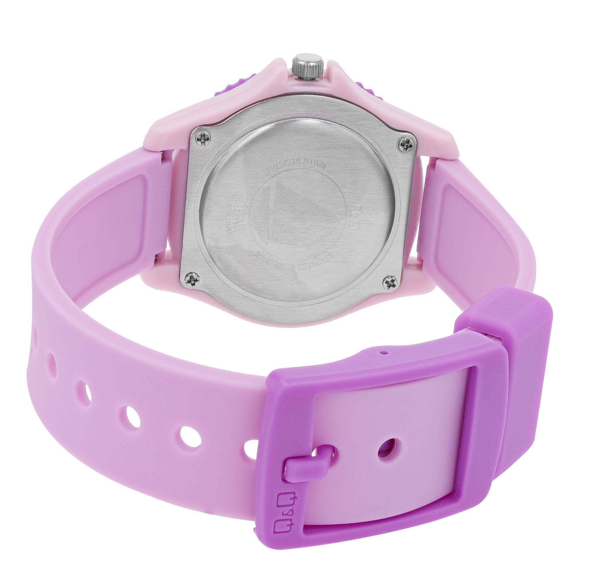Q&Q kinderhorloge met siliconen band - een vrolijk accessoire dat niet alleen de tijd aangeeft, maar ook de fantasie van kinderen inspireert. Het hoogwaardige kwartsuurwerk staat niet alleen garant voor nauwkeurige tijdsaanduidingen, maar ook voor een betrouwbare levensduur. Met een waterbestendigheid van maar liefst 10 ATM is dit horloge perfect voor alle avonturen, of het nu gaat om spetteren in het zwembad of ravotten in de buitenlucht. De paarsgekleurde siliconen band zorgt niet alleen voor een comfortabele pasvorm, maar geeft het kinderhorloge ook een speelse charme. De gesp zorgt ervoor dat het horloge goed om de pols blijft zitten. De kunststof kast met een paarsgekleurde lunette voegt een modieus accent toe en maakt van dit horloge een echte blikvanger.