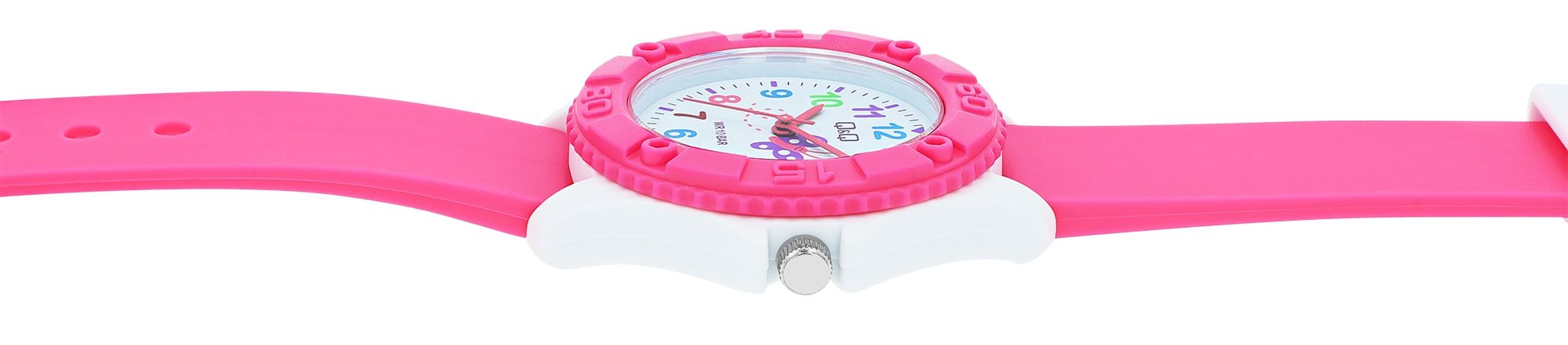 Q&Q - by Citizen Watch Co. LTD kinderhorloge met siliconen band - een vrolijk accessoire dat niet alleen de tijd aangeeft, maar ook tot de verbeelding van kinderen spreekt. Het hoogwaardige kwartsuurwerk staat niet alleen garant voor nauwkeurige tijdsaanduidingen, maar ook voor een betrouwbare levensduur. Met een waterbestendigheid van maar liefst 10 ATM is dit horloge perfect voor alle avonturen, of het nu in het zwembad is of buiten. De roze siliconen band zorgt niet alleen voor een comfortabele pasvorm, maar geeft het kinderhorloge ook een speelse charme. De witte gesp zorgt ervoor dat het horloge goed om de pols blijft zitten. De kunststof kast in wit, gecombineerd met een roze lunette, voegt een modieus accent toe en maakt van dit horloge een echte blikvanger.