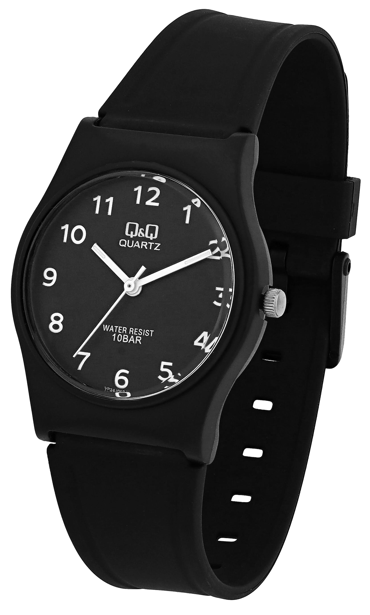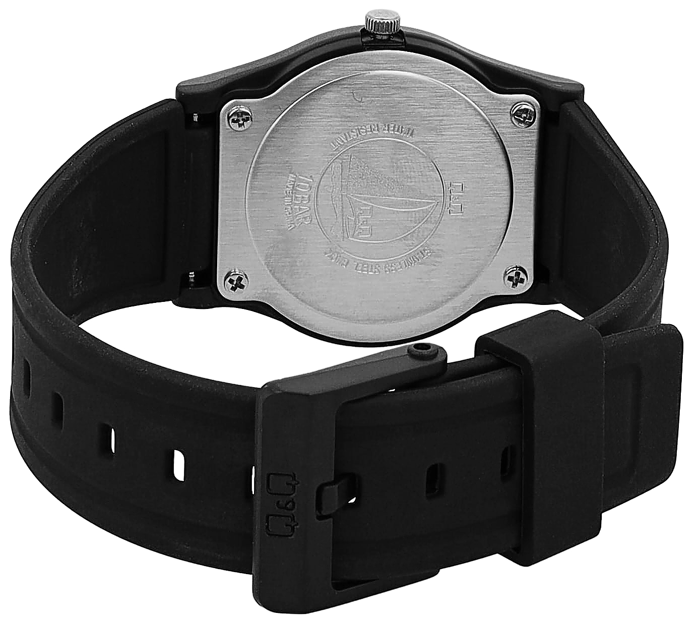 Het analoge 3-hands jeugdhorloge van het merk Q&Q - by Citizen Watch Co. LTD heeft een hoogwaardig en nauwkeurig quartz uurwerk. De zwarte siliconen band is 21 mm breed bij de lug en kan worden geopend en gesloten met een zwarte kunststof gesp. De totale lengte van het horloge is 24 cm. De zwarte kunststof kast heeft een diameter van 33 mm en een kasthoogte van 10 mm. De achterkant van de kast is gemaakt van roestvrij staal en is aan de kast bevestigd met vier roestvrijstalen schroeven. De zwarte wijzerplaat met witte Arabische cijfers maakt het gemakkelijk om de tijd af te lezen. Het horloge is ook comfortabel om te dragen dankzij de zachte siliconen band en het eenvoudige ontwerp maakt het gemakkelijk te combineren. Het horloge is ook waterbestendig tot 10 ATM, wat betekent dat het klaar is om trouw dienst te doen tijdens alle activiteiten, of je nu gaat zwemmen, snorkelen of gewoon je handen wassen.