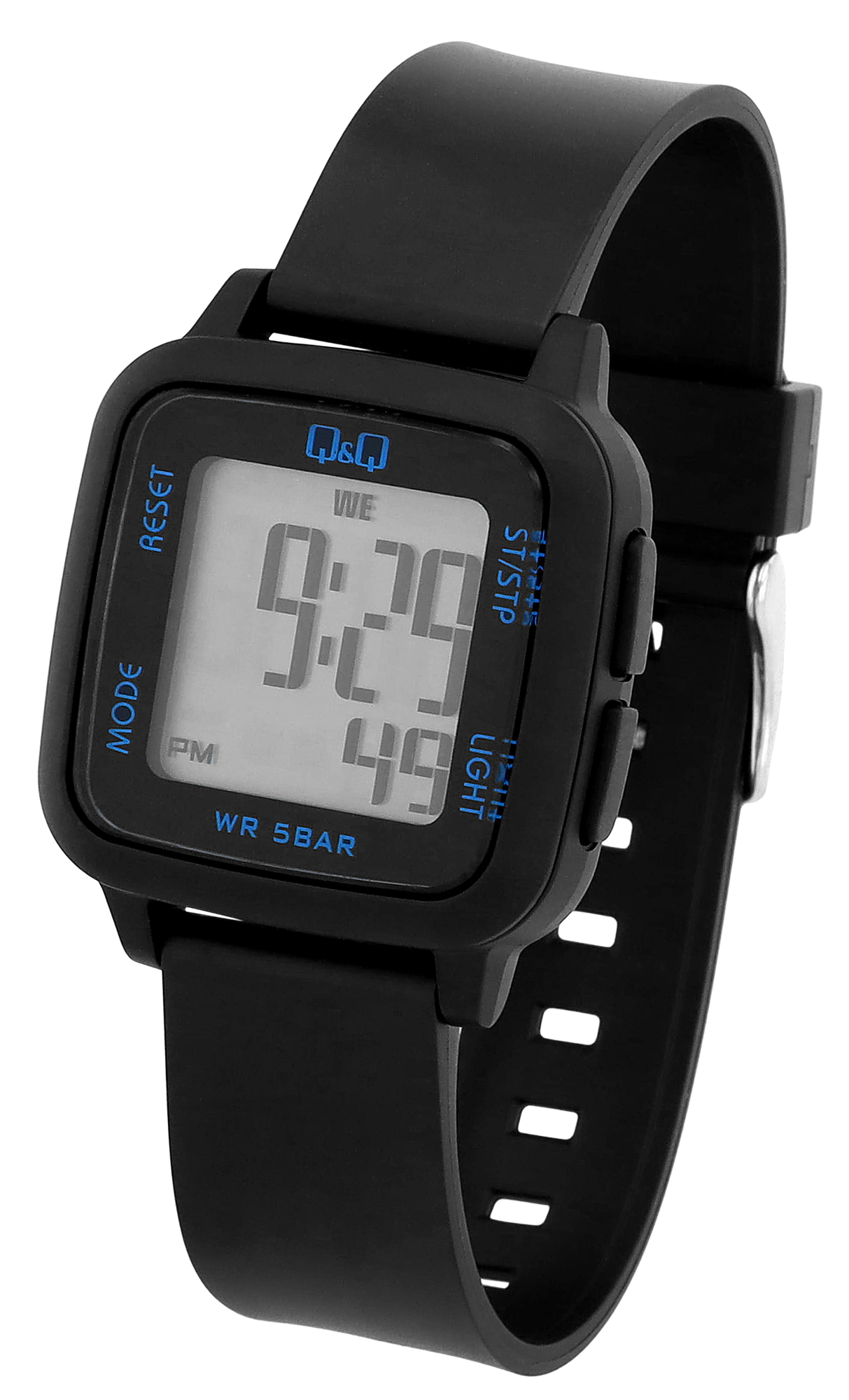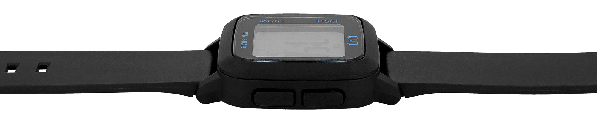 Productinformatie "Q&Q unisex digitaal horloge, kunststof, siliconen band, zwart, 5 ATM, 34 x 34 mm"