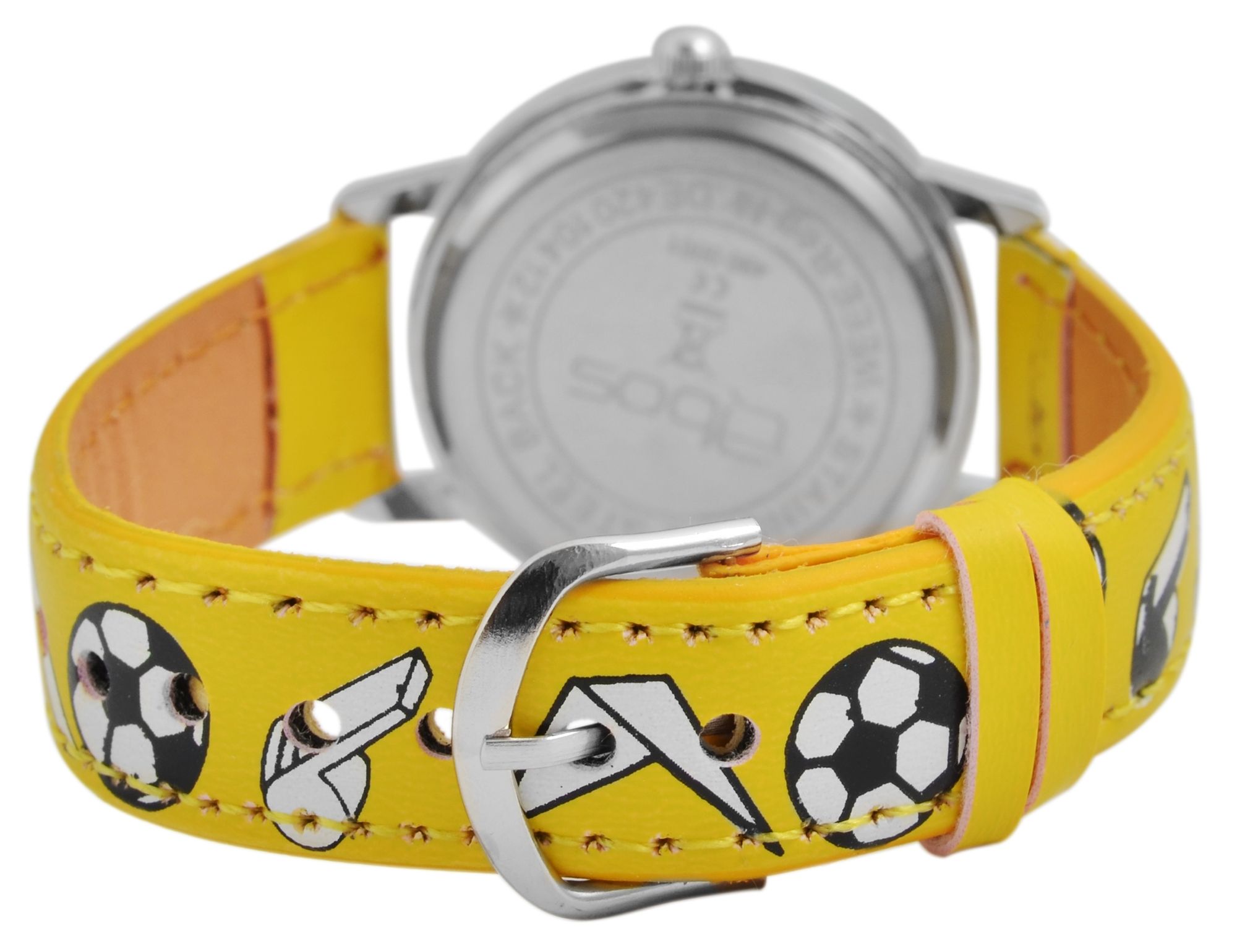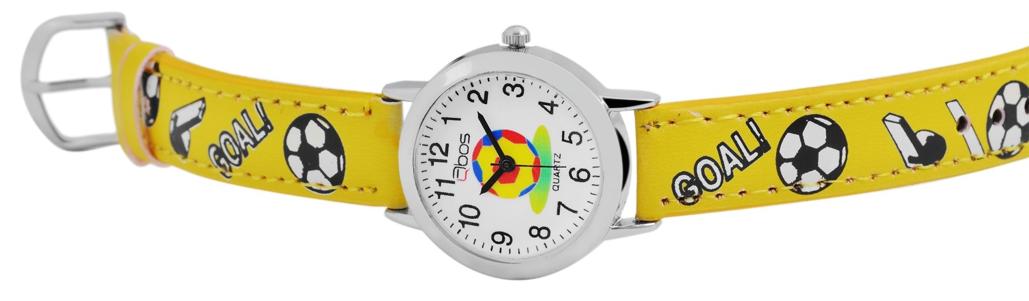 Het analoge 3-hands kinderhorloge van het merk QBOS heeft een hoogwaardig kwartsuurwerk. De gele band van imitatieleer is 14 mm breed bij de lug en wordt geopend met een zilverkleurige gesp. De band en wijzerplaat zijn versierd met sportieve motieven en zijn een leuke manier voor kinderen om de tijd te leren zien. De totale lengte is 20 cm. De zilverkleurige metalen kast met mineraalglas meet 28 mm en is 8 mm hoog. Het kastdeksel is gemaakt van roestvrij staal. De Arabische cijfers en de kleurgecoördineerde wijzers in zwart maken het aflezen van de tijd kinderspel. Een leuk cadeau voor kinderen, bijvoorbeeld voor een eerste schooldag of een verjaardagsfeestje.