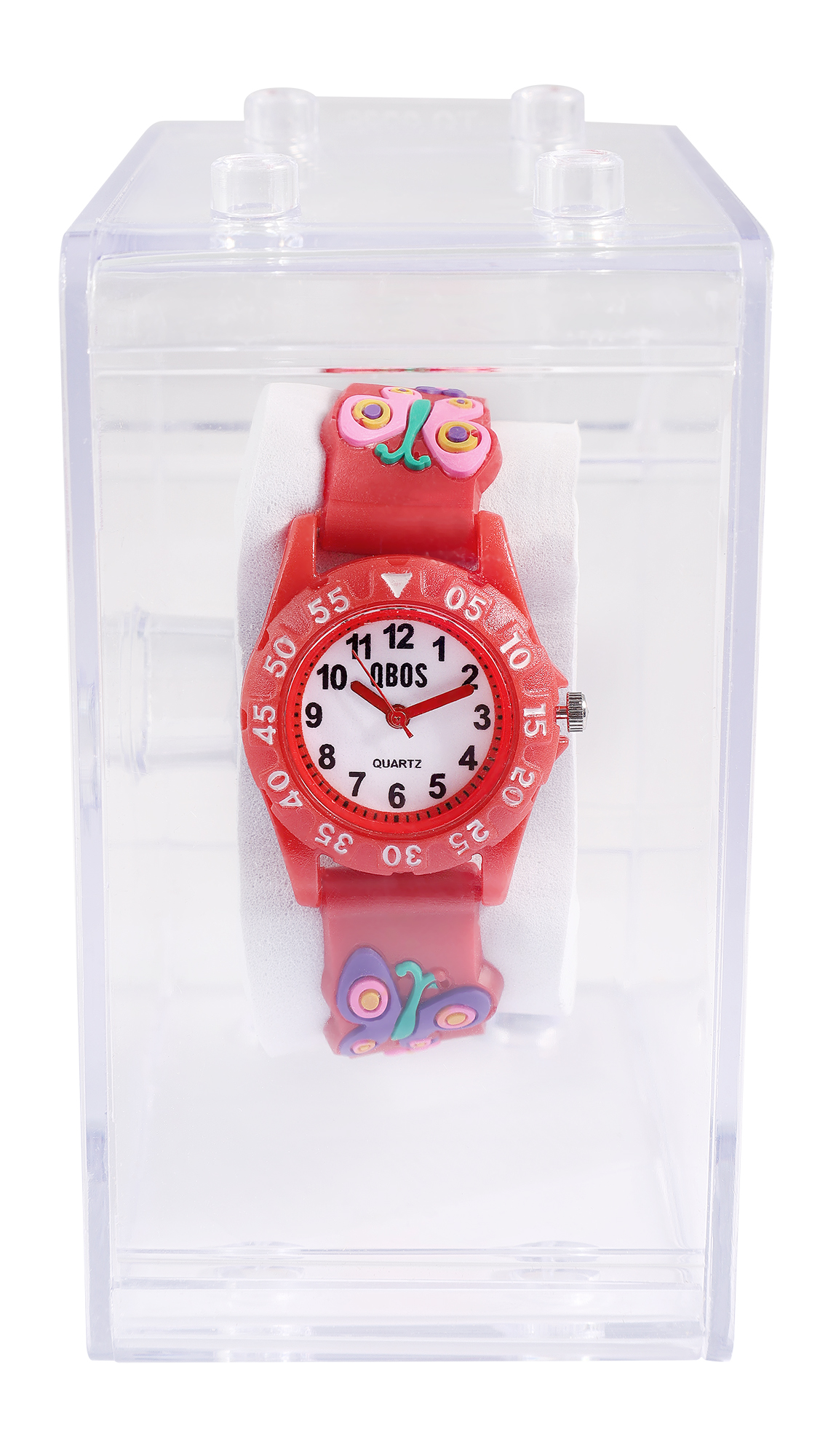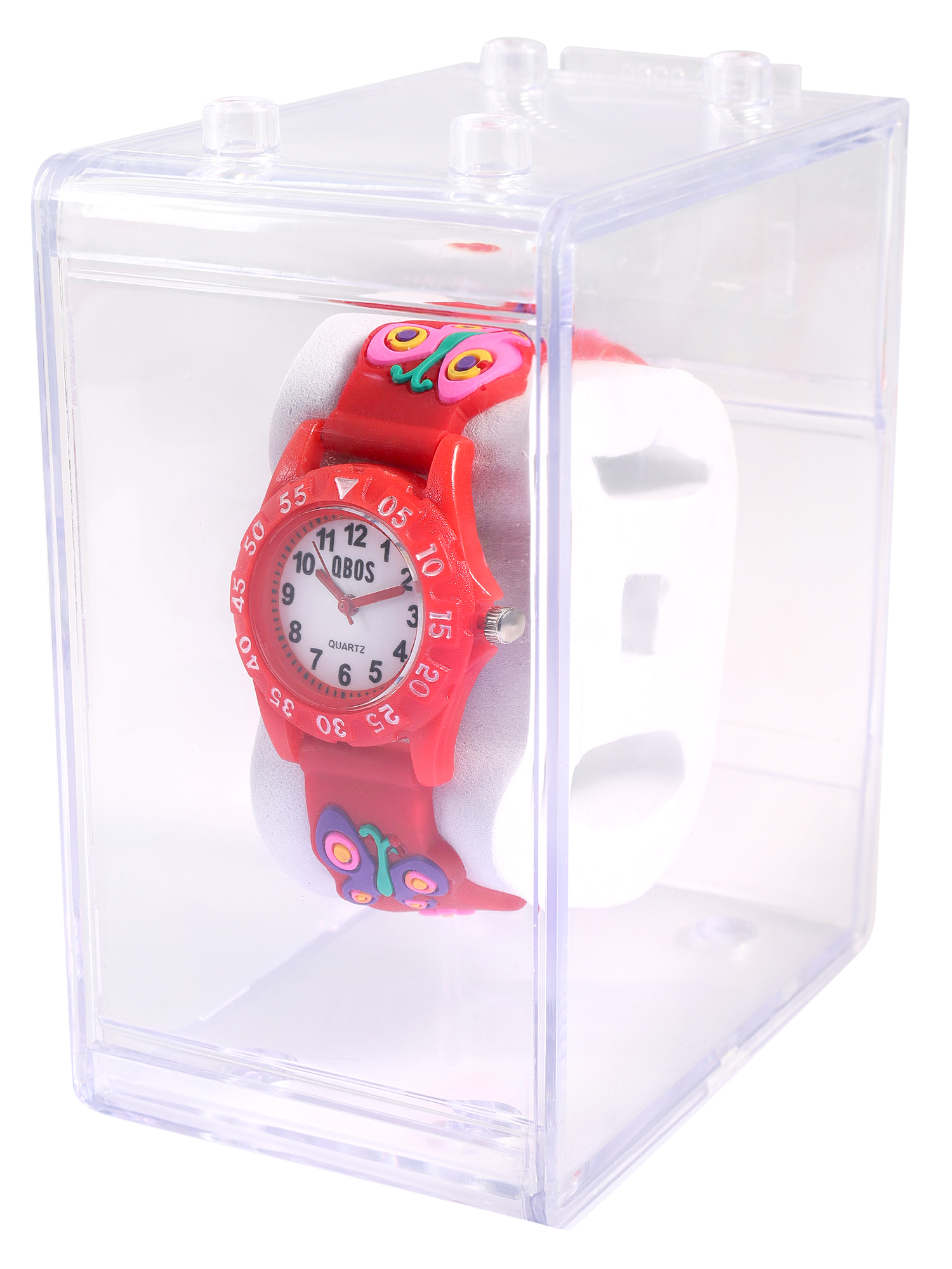 QBOS Kinderuhr mit Silikonband, Schemtterling, rot, Ø 28 mm inkl. Box