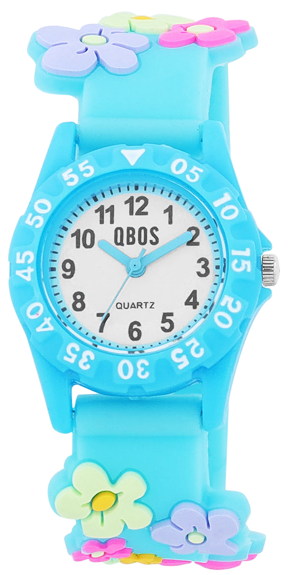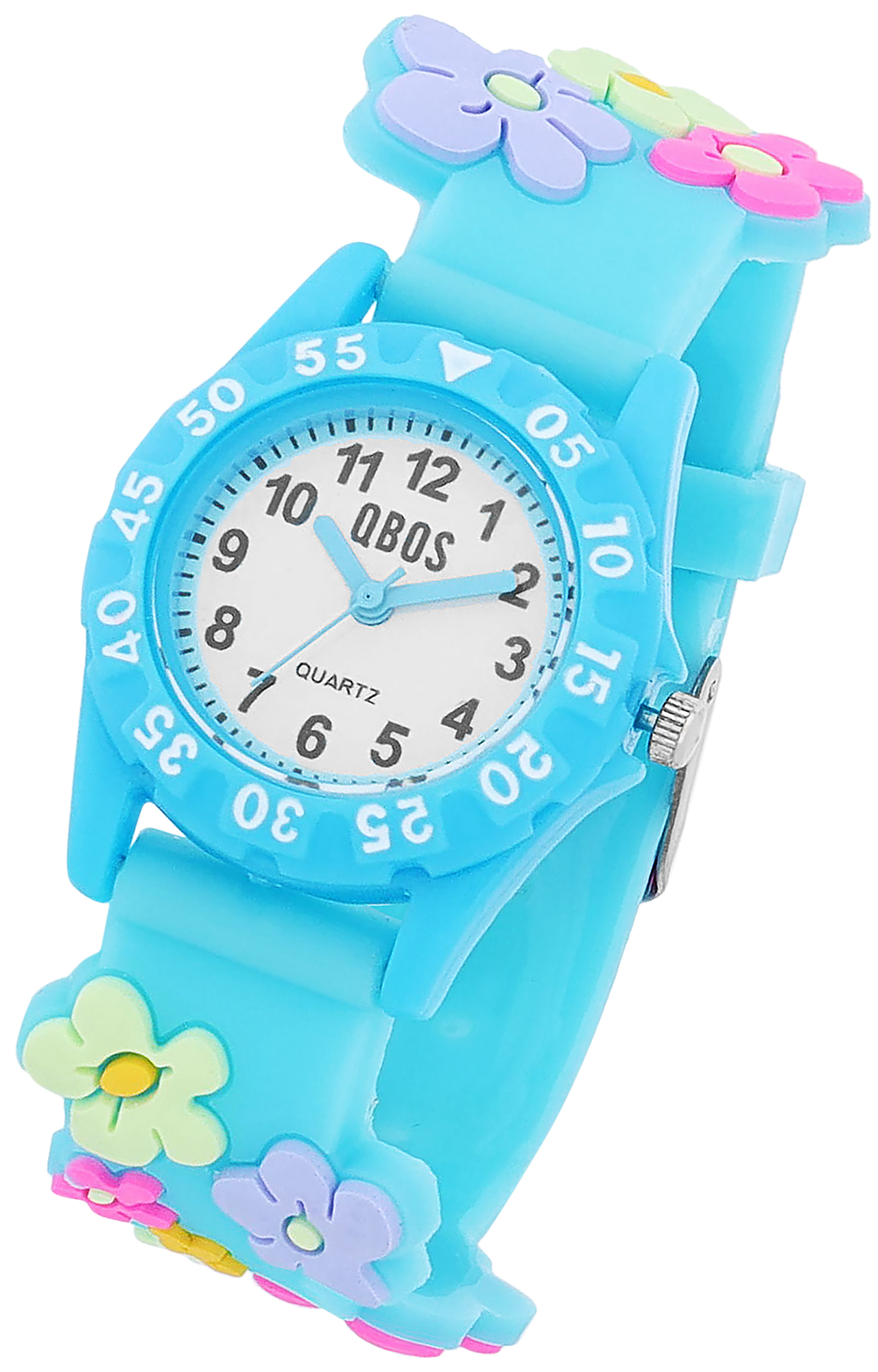 Productinformatie "Qbos Kinderuhr mit Silikonband, bunt, Motiv Blume, Ø 28 mm, hellblau"