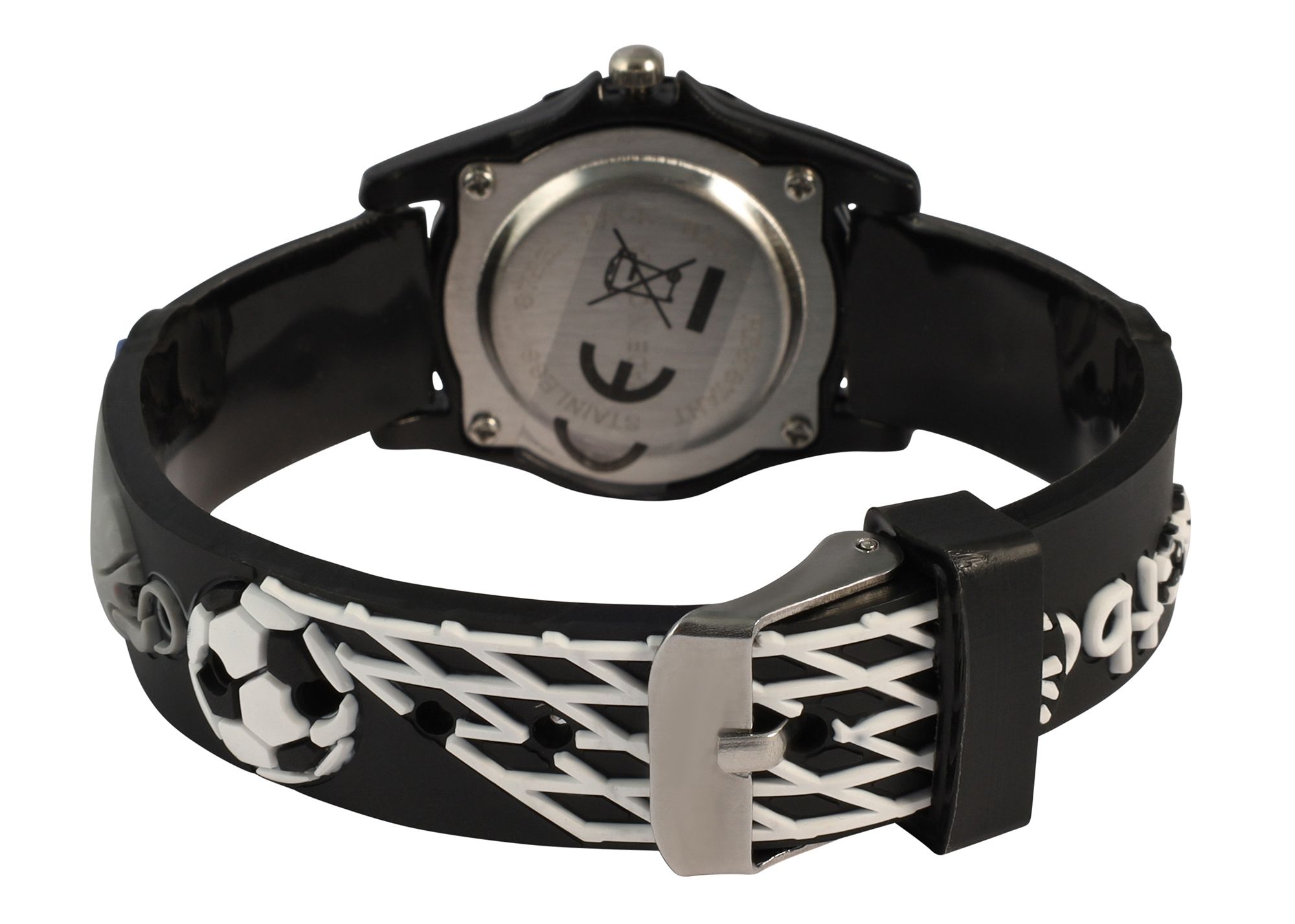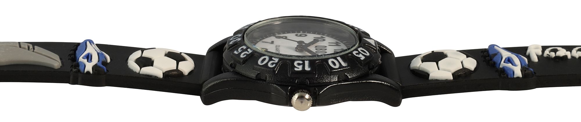 De vrolijke vrijetijdslook wordt benadrukt door een dynamisch voetbalmotief op de band. De ronde kast van 28 mm met een hoogte van 9 mm heeft een lunette met duidelijke cijfers van 5 tot 55, waardoor je samen met de analoge wijzerplaat en de grote Arabische cijfers gemakkelijk de tijd kunt aflezen. Met een totale lengte van 19 cm en een bandbreedte van 14 mm is dit lichtgewicht en duurzame horloge de ideale partner voor actieve kinderen.
