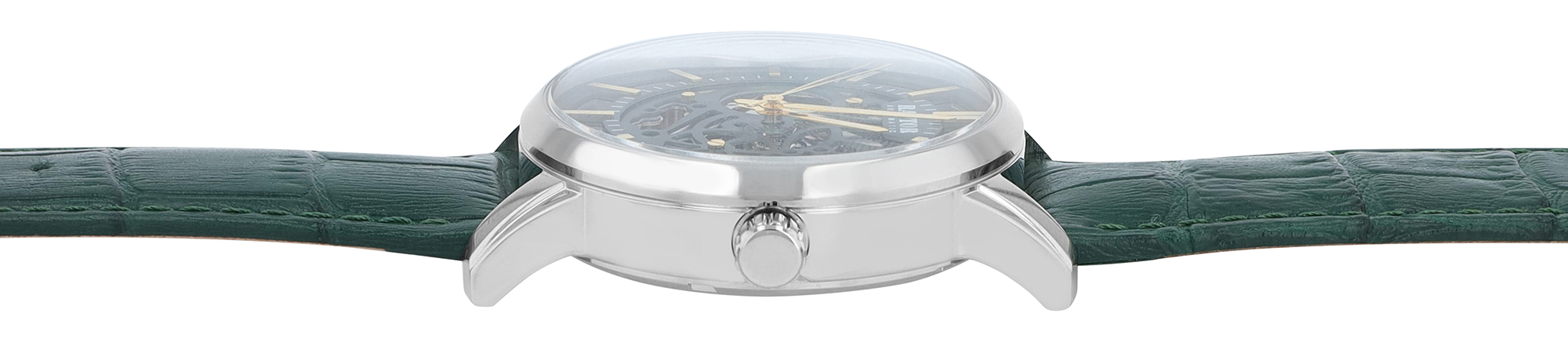 De wijzerplaat in een stijlvol vintage design benadrukt duidelijke lijnindices en fijne details. Lichtgevende wijzers garanderen een goede afleesbaarheid, zelfs bij weinig licht, terwijl het open skeletontwerp op kunstzinnige wijze het binnenwerk laat zien - een echte blikvanger voor kenners en liefhebbers van mechanische uurwerken. Comfort en stijl worden ook gecombineerd in de horlogeband van echt leer in een verfijnde krokodillenleren look. Het wordt vastgemaakt met een hoogwaardige roestvrijstalen vlindersluiting - fijn verstelbaar via een kleine schroef die functionaliteit combineert met fijne technologie. Met een totale lengte van 23 cm en een brugbreedte van 22 mm past het horloge comfortabel om de pols.